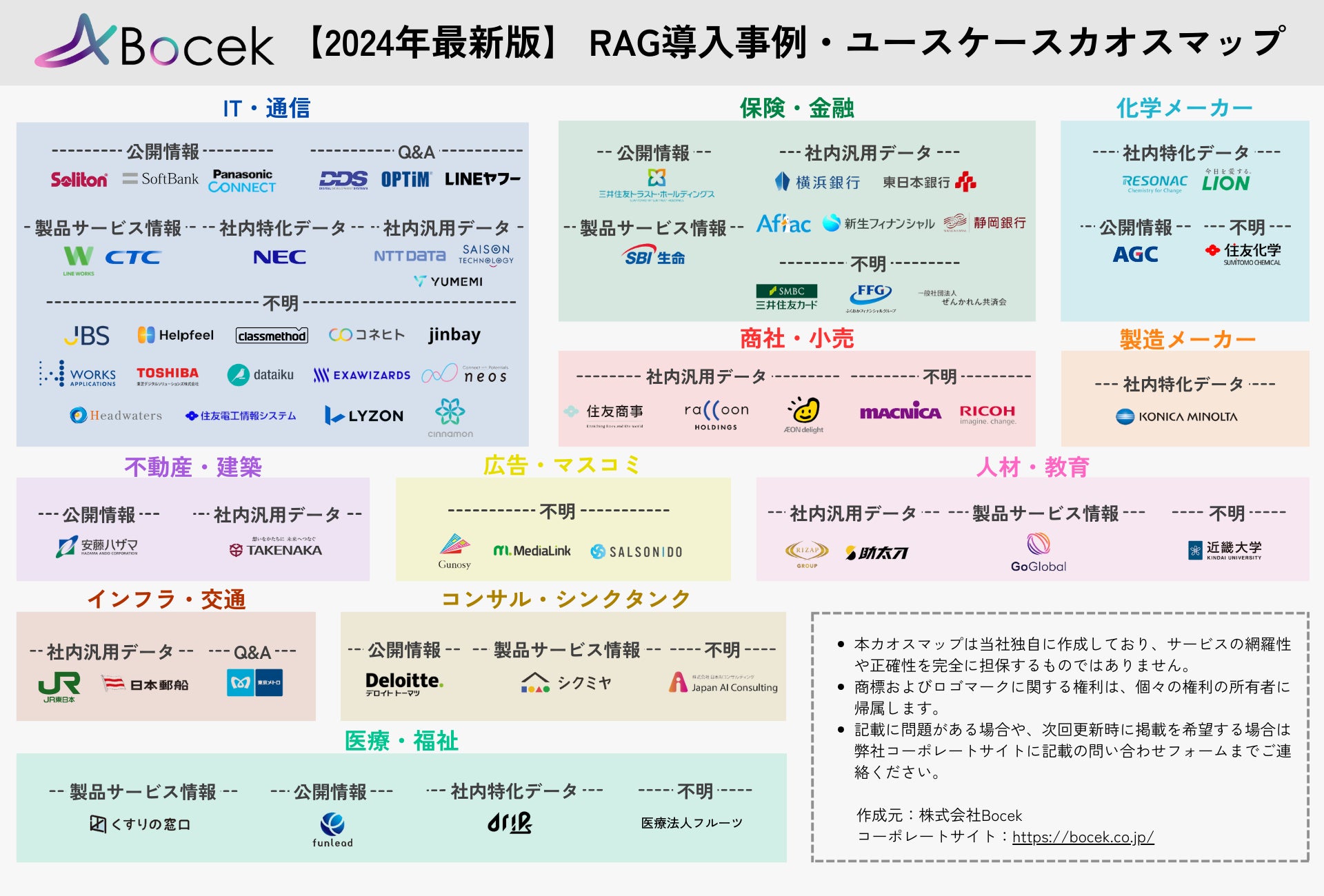 本カオスマップは、各社Webサイトやプレスリリース等の公開情報を元に、株式会社Bocekが独自に調査を行い、RAG導入を行っている企業を以下のカテゴリに分けて掲載しています。