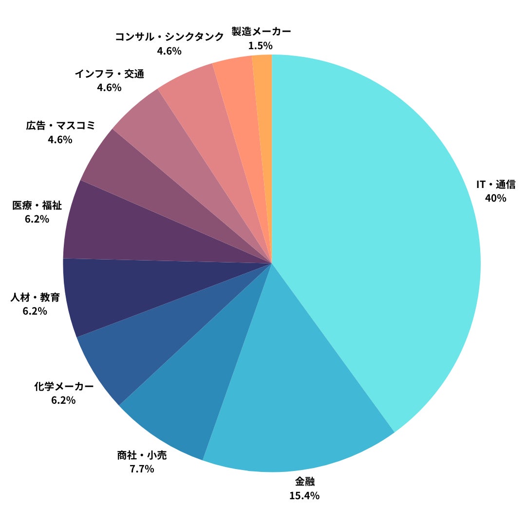 金融、商社・小売、IT・通信、広告・マスコミ、人材・教育、インフラ・交通・物流、不動産・建築、旅行・観光、医療・福祉、コンサル・シンクタンク、製造メーカー、化学メーカー