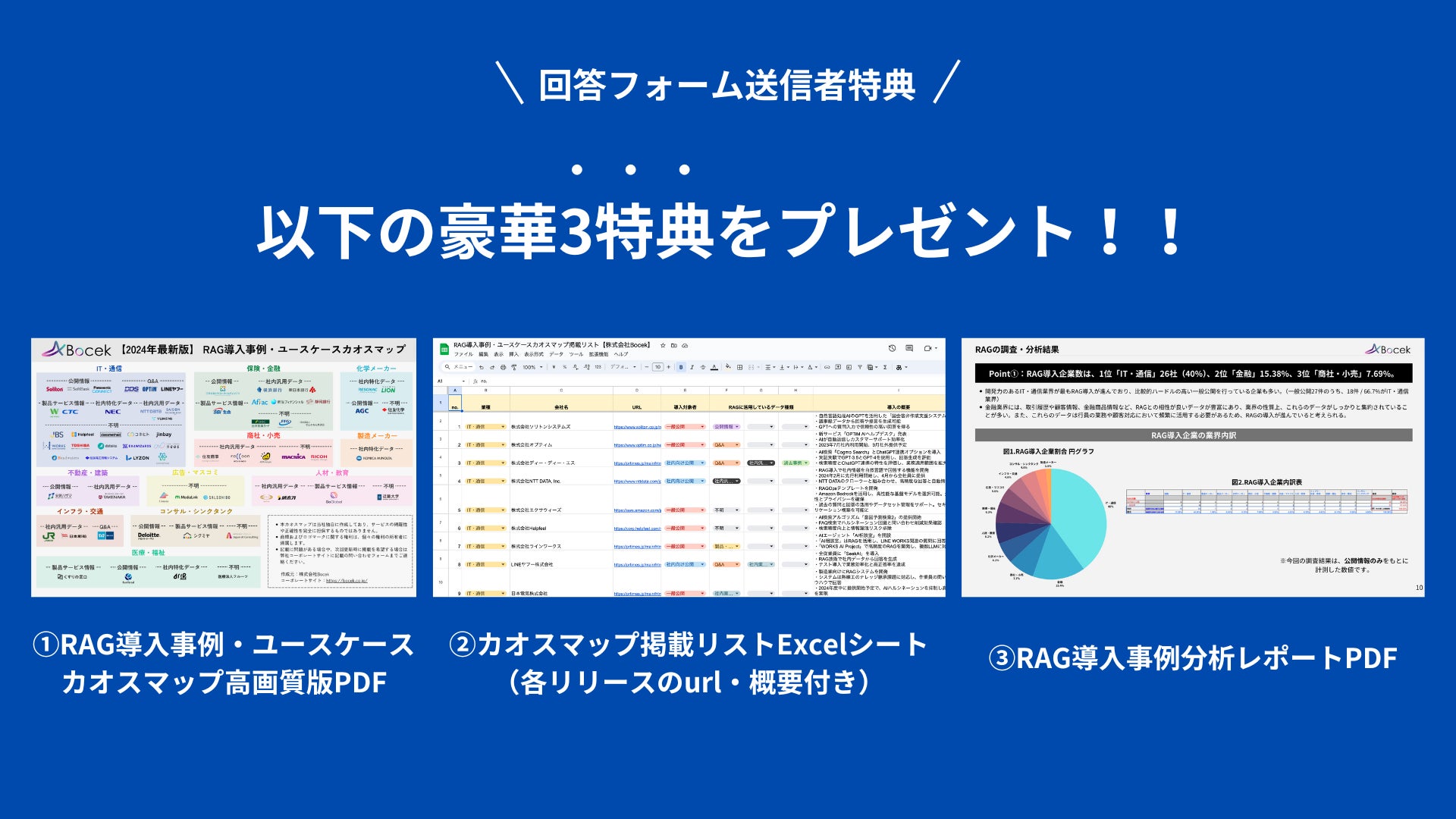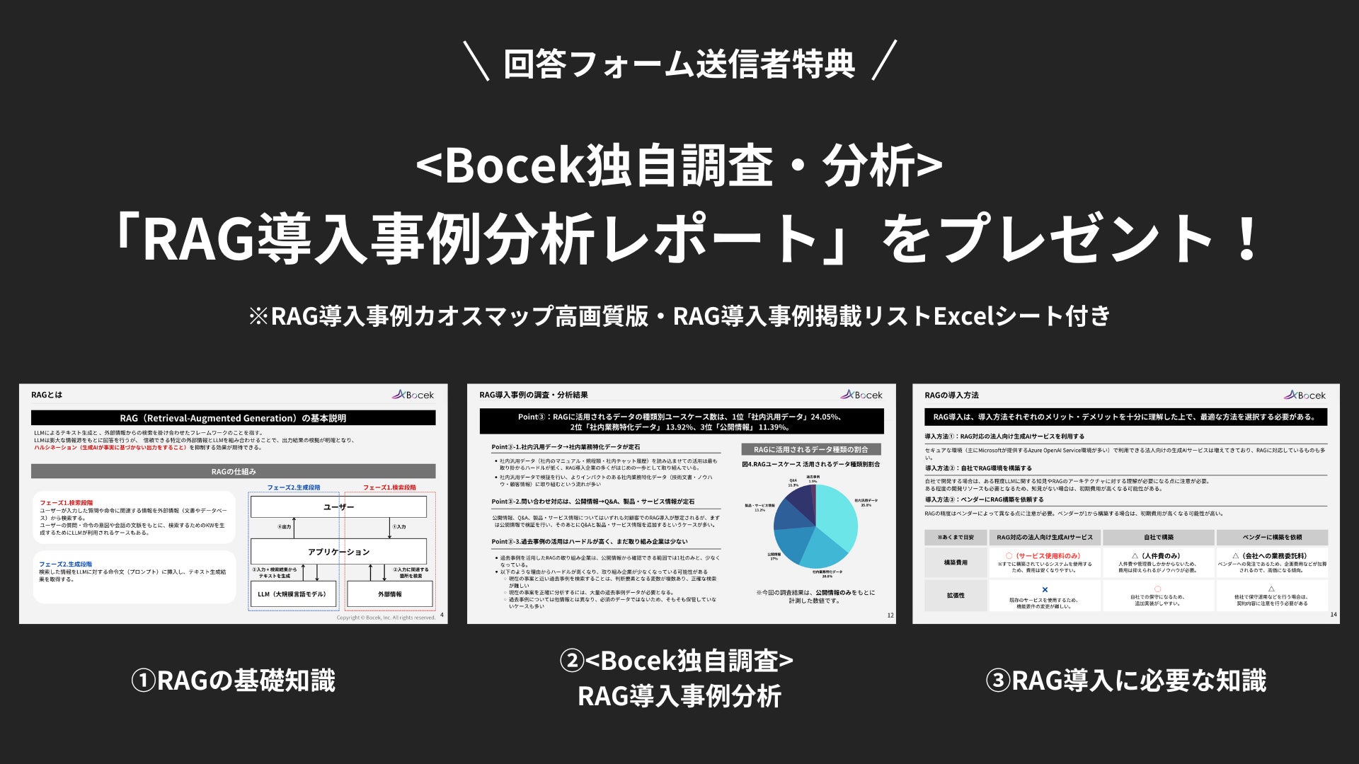 また、Bocekのコンサルタントが今回の調査結果をもとに作成した、「RAG導入は、社内向け公開→一般公開が定石。」などの分析結果をまとめたレポート資料も以下のフォームからダウンロード可能です。