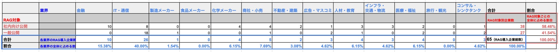・RAGの導入企業のうち、社内公開38企業(58.46%)、一般公開企業(41.54%)となっている。