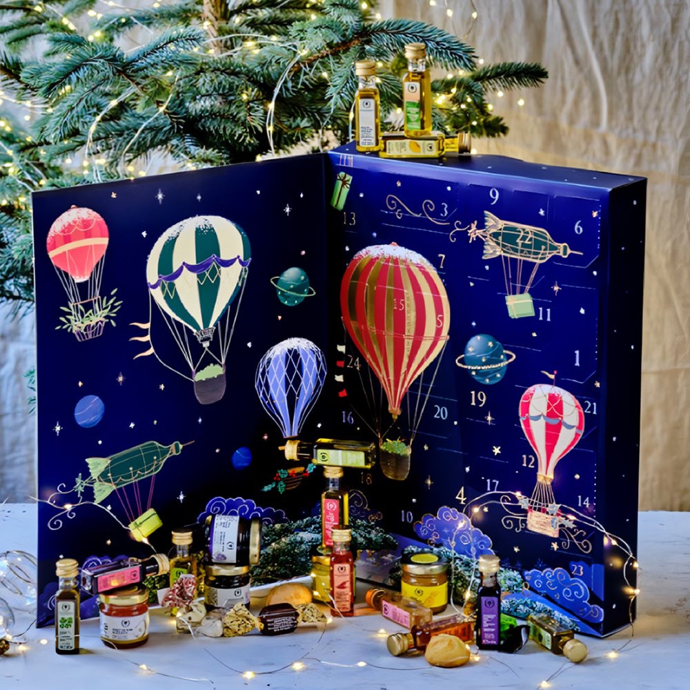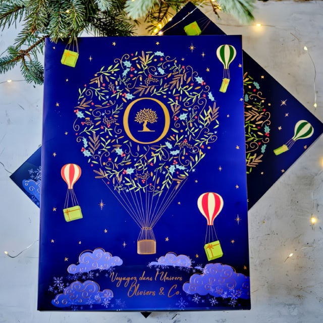2024年のアドベントカレンダーは、魅惑的な世界への旅をテーマに、 冬の夜空に浮かぶ色とりどりの気球とOLIVIERS&COオイルボトルを模した飛行船がデザインされています。