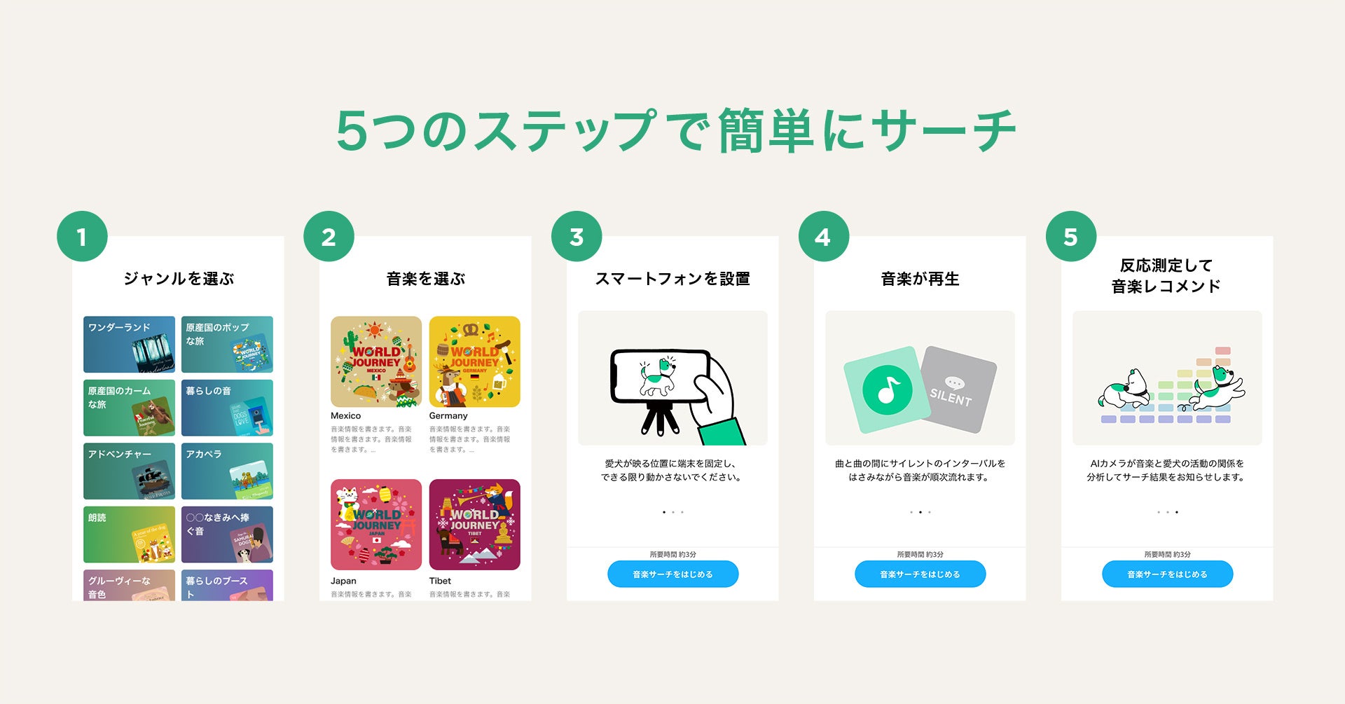 そこで、飼い主さまと愛犬が一緒にいるときに、いろんな音楽からより手軽に自動で音楽を探っていただけるように、新機能「音楽サーチモード」を開発しました。この新しい機能は、アカウントを作成いただいくだけで、すべての飼い主さまが無料で体験いただけます。