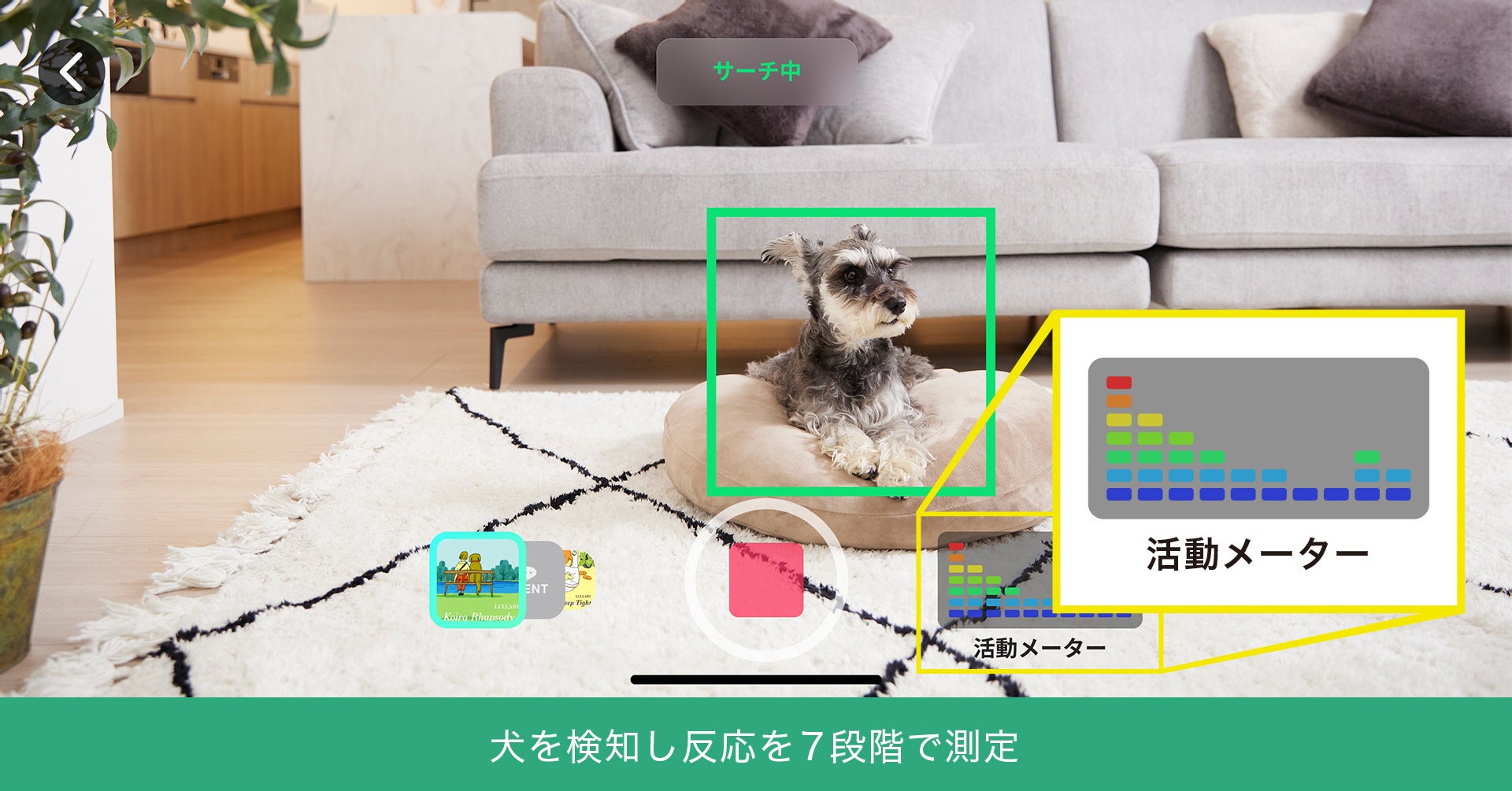 「音楽サーチモード」では、30秒程度のショートバージョンの音楽を使い、音楽に対する反応を AI カメラが自動計測・分析し、流した音楽の中からもっとも愛犬がリラックスした音楽を提示します。従来の反応を飼い主さまが選択する手動選択や1日のお留守番後に提案するレコメンド機能とは異なり、一緒の時に短時間で好みを分析することができます。本機能は無料でご利用いただけますので、よりいっそう多くの飼い主さまに体験いただければ幸いです。