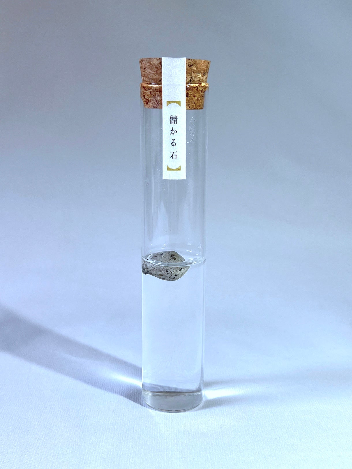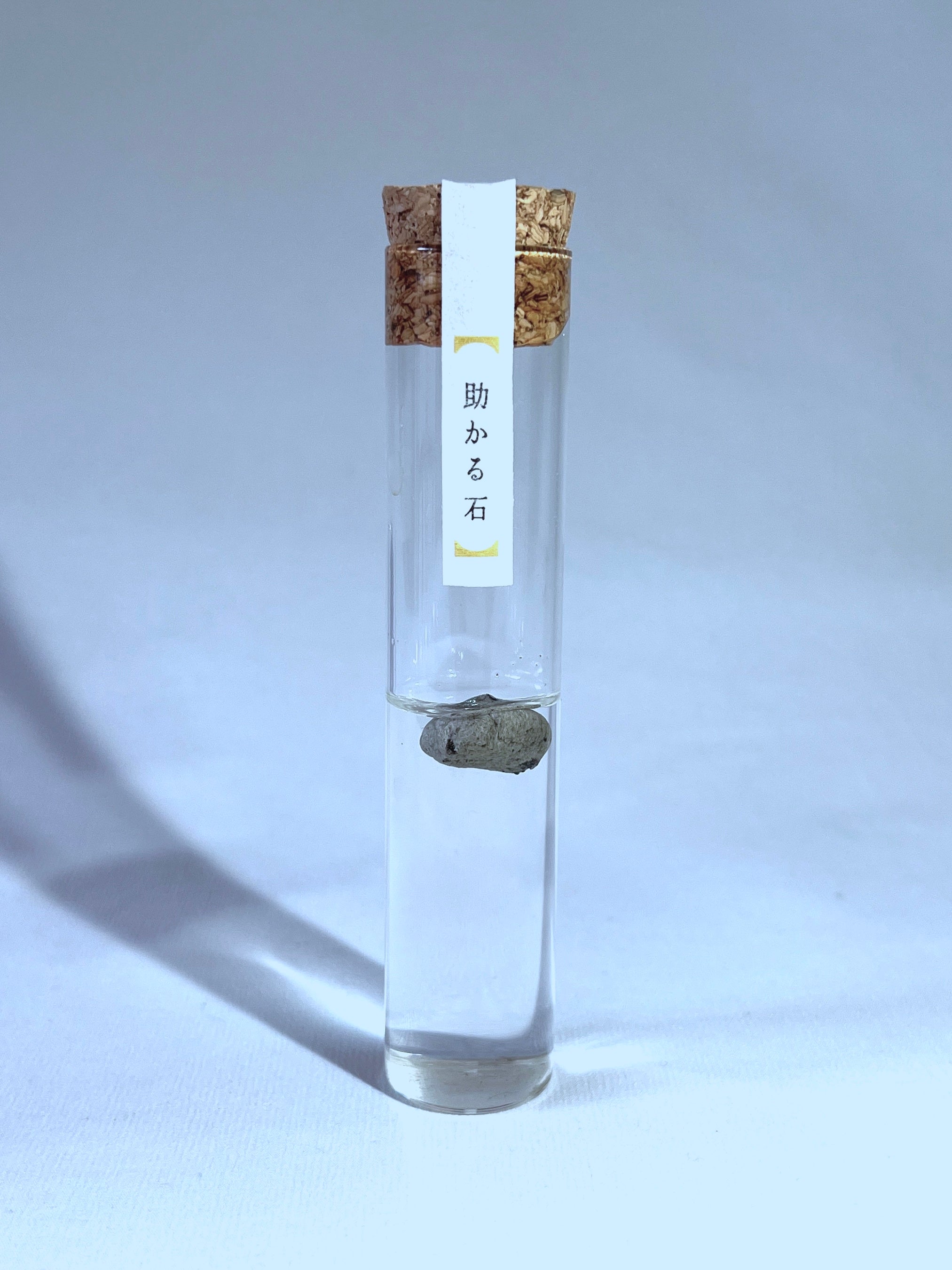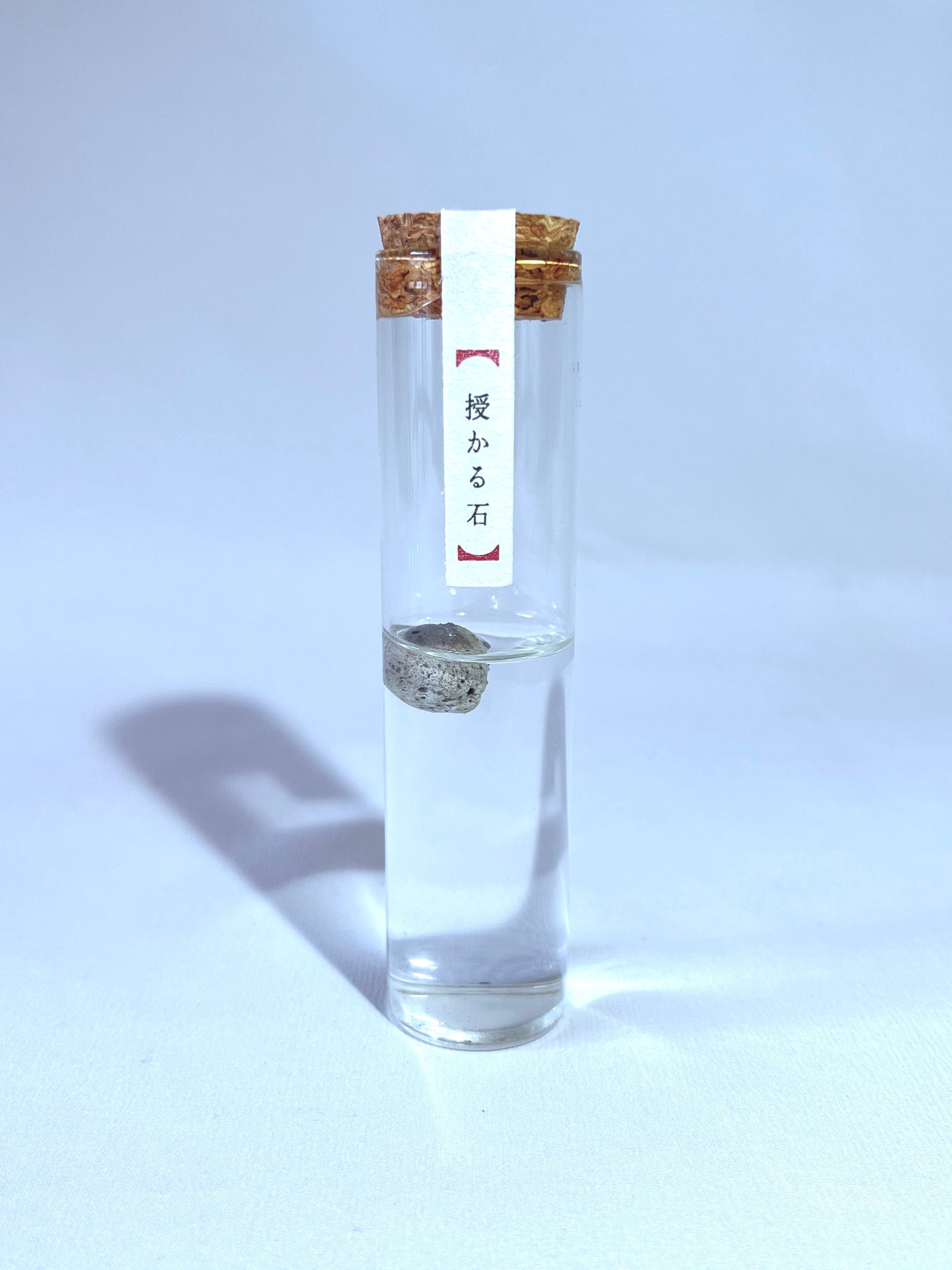 ガラスボトルに「御神水」を入れ、そこに浮かべることで、 一目で「軽石 」だと分かるデザインです。
