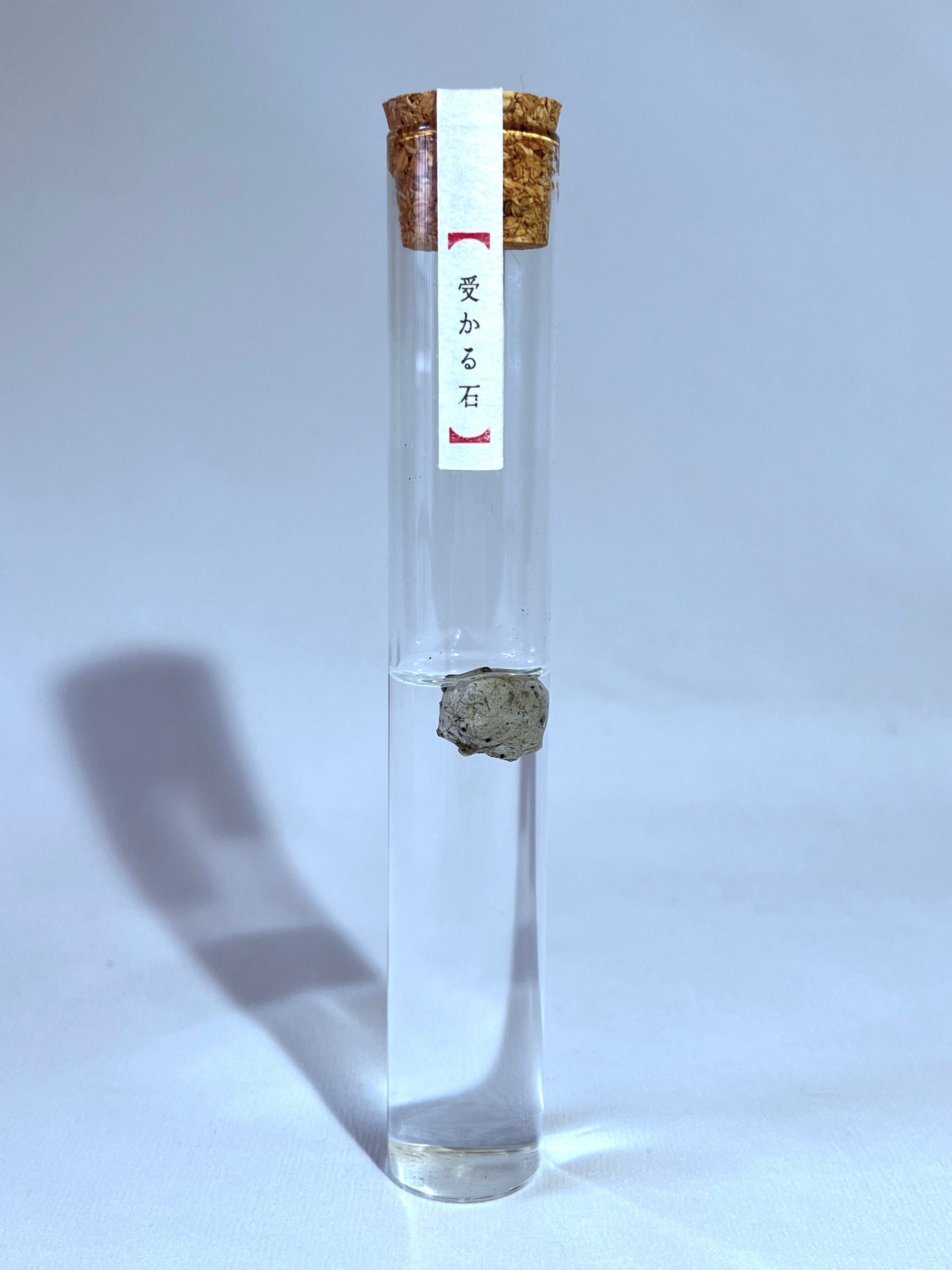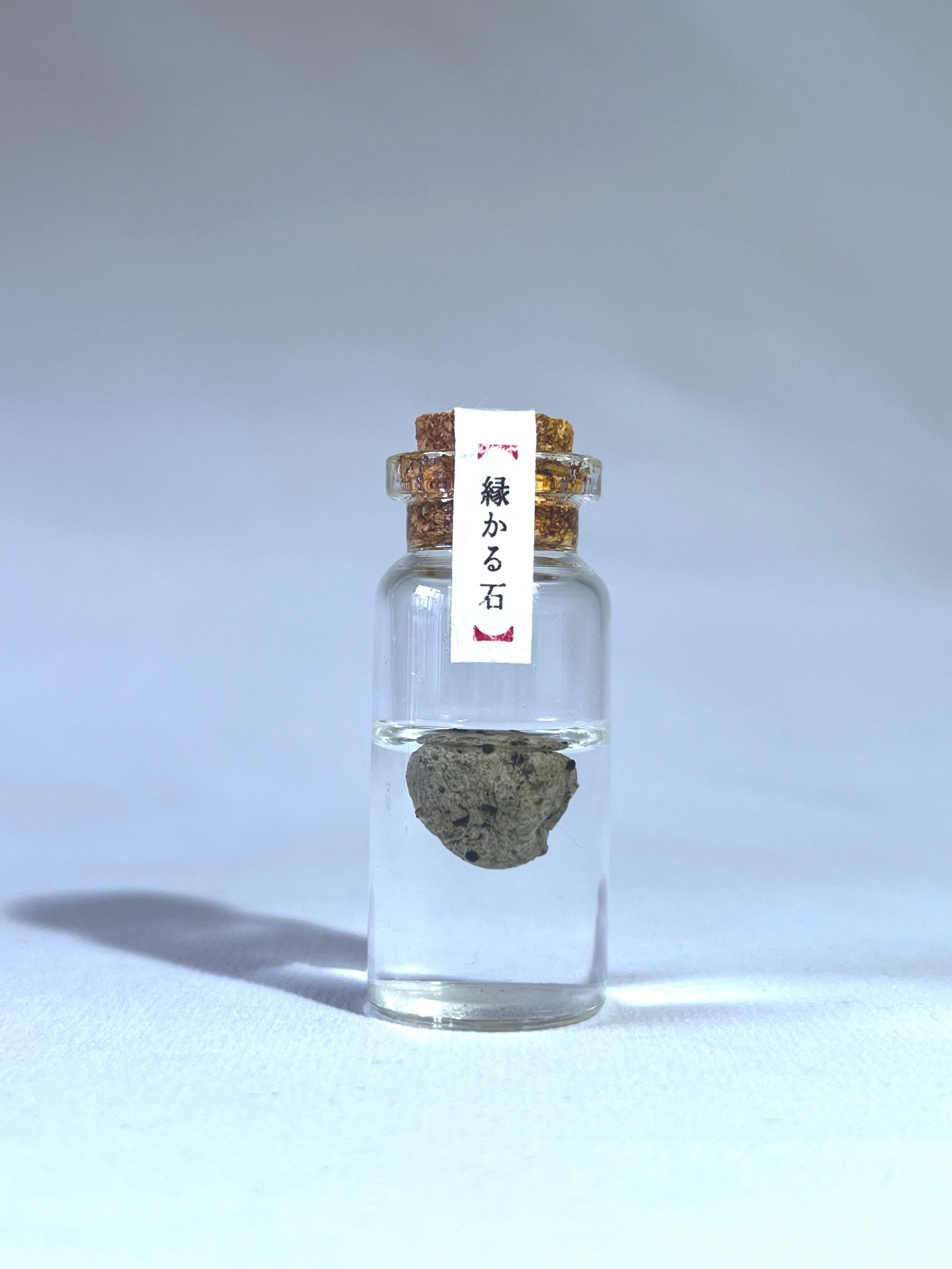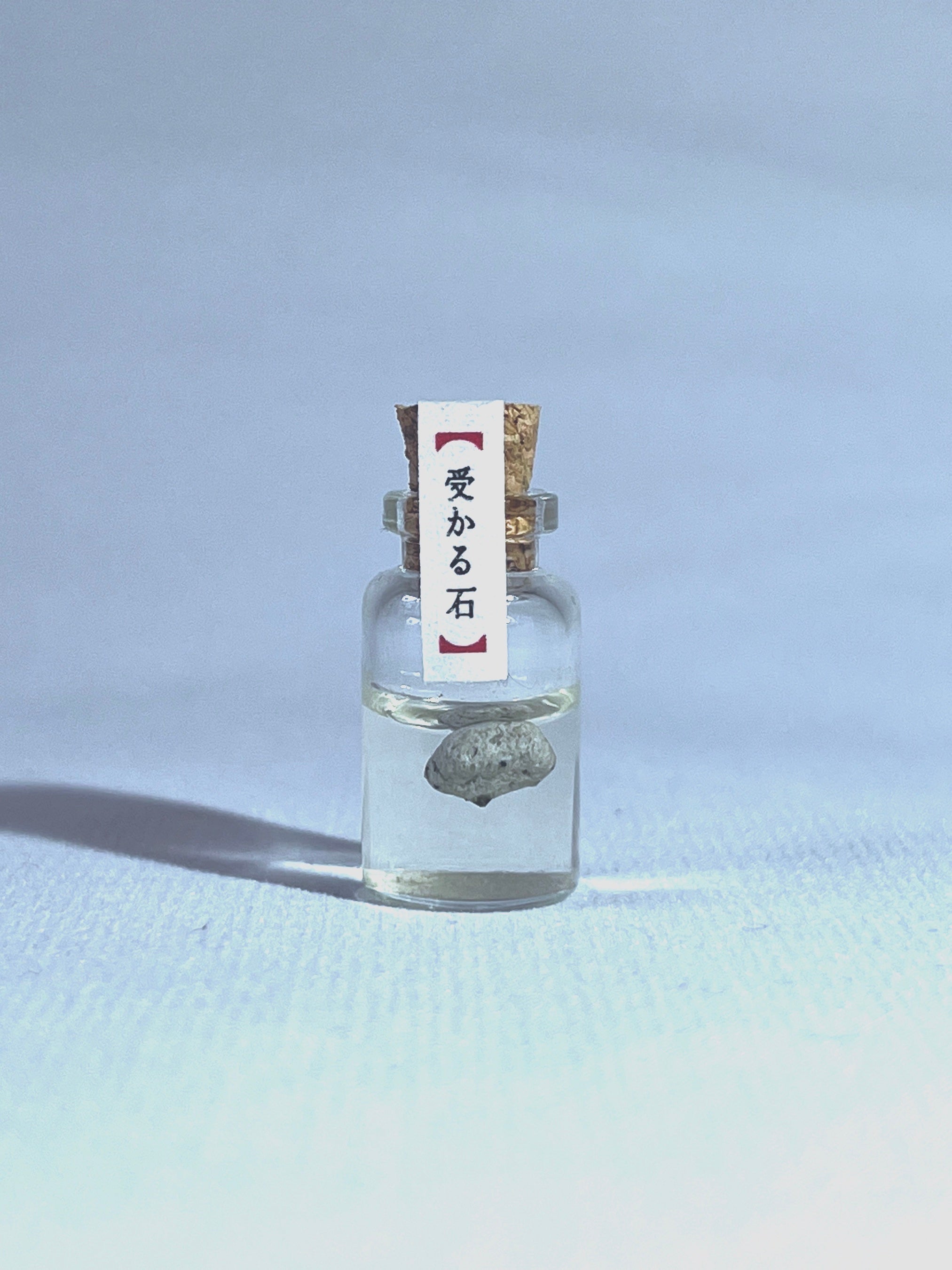 素材 : 軽石 ( 沖縄の海岸で採取 ) / 水 ( 御神水 ) / ガラス製ボトル / コルク/ 封印 ( 月桃紙 )