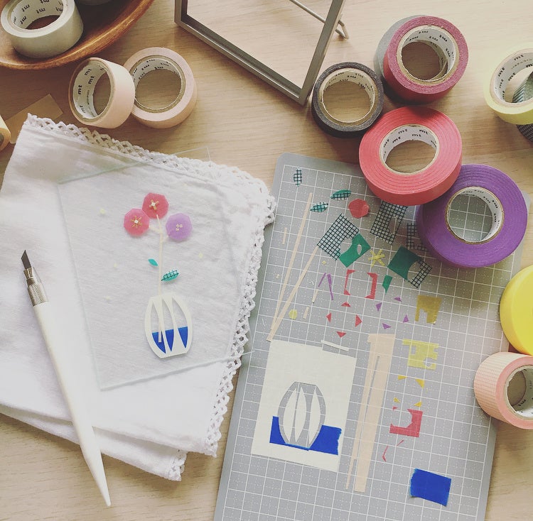 テープをデザインナイフでカッティングして描いています。季節の草木花、暮らしのものなどを、凛とした中にも素朴なあたたかさのある色の組み合わせを大切にしながら描いています。