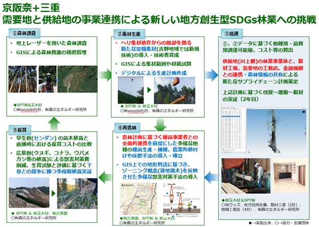 本事業は、京阪奈地区および三重地区において、種苗・木材生産とその利活用を通じて、需要地(京阪奈+三重エリアの製材工場【川中】、都市部の地域密着型の工務店【川下】)と供給地(種苗・素材生産事業者【川上】)が相互に事業連携し、もって地域経済を活性化させ、地方創生型SDGs林業に挑戦しようとする新たな取り組みです。