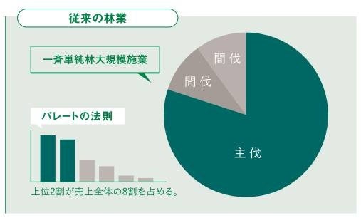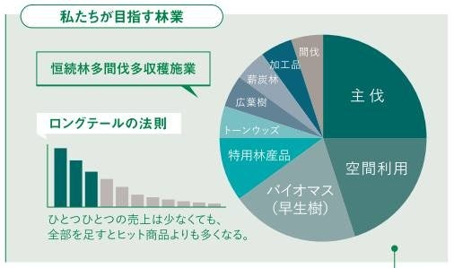 山林のICTデータを整備して森林情報だけでなく毎木単位で情報を「見える化」し、需要側のニーズを組み入れたゾーニング概念(適地適木)にもとづく多様な森林づくりを立案することで、収益を最大化するサプライチェーンを作り上げ、新たな安定したロングテール型収益構造を形成することを目指しています。スギ・ヒノキのみではなく早生樹・広葉樹などの多様な木材を生産し、キャンプ場などの空間的な利用も含めて新たな価値を創出していく将来目標を掲げています。