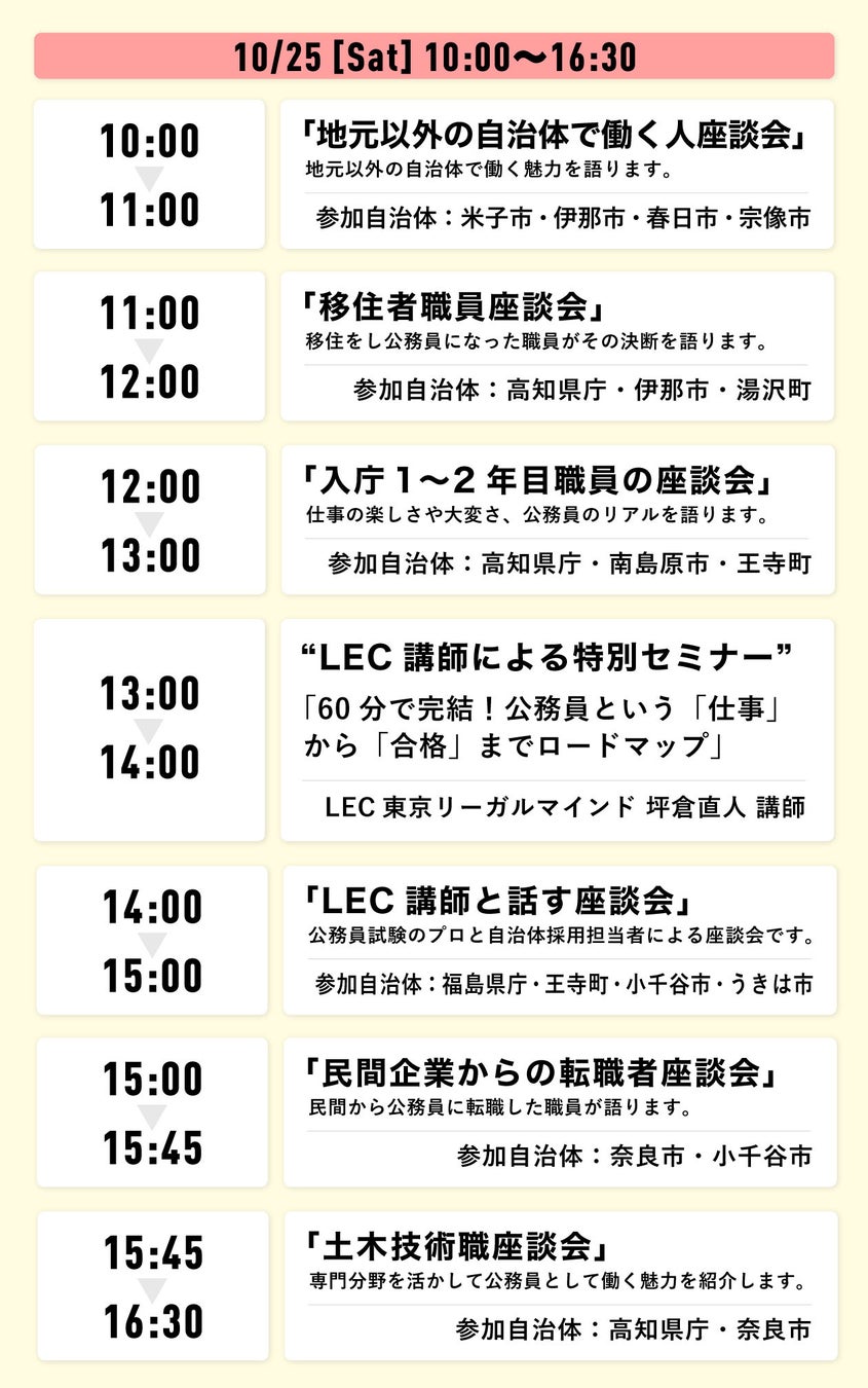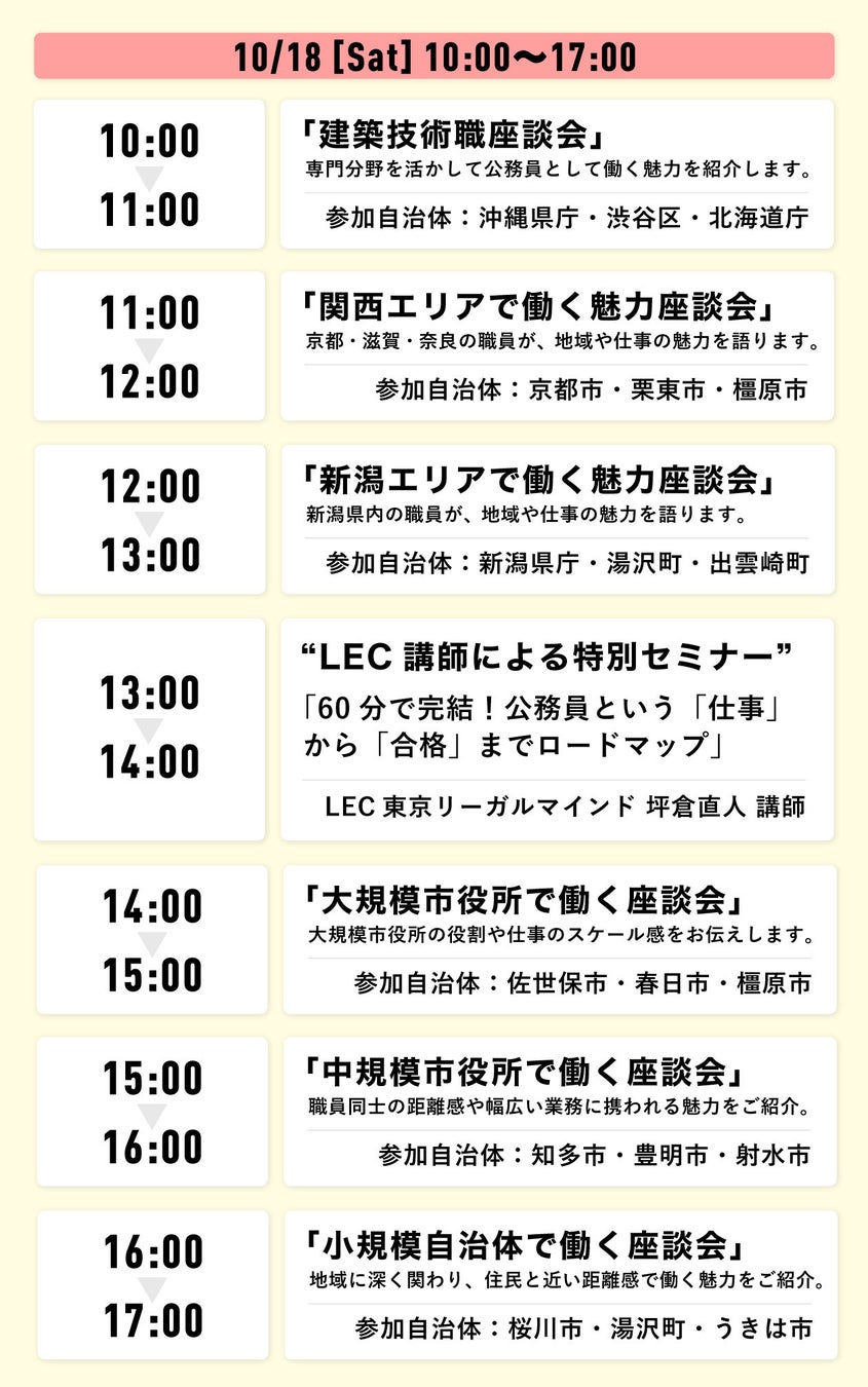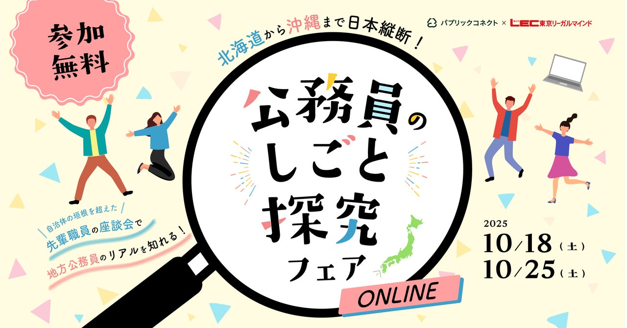 官公庁・自治体向け採用プラットフォームシステムを提供する株式会社パブリックコネクト(本社:大阪府大阪市、代表取締役:平田祐太郎、以下「当社」)は、2025年10月18日(土)および25日(土)の2日間、オンラインイベント「〜北海道から沖縄まで全国縦断!〜 公務員のしごと探求フェア online」を株式会社東京リーガルマインドと共同で開催いたします。