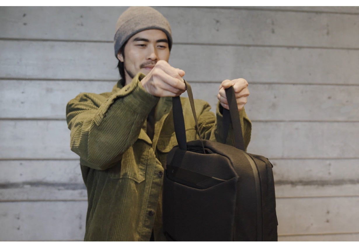 3)収納可能なハンドル…リュックやショルダーで持つ時に気になる手持ちハンドルが、収納できます。ハンドル先を引き上げればすぐにブリーフモードで使えるので、取引先に向かう時や、TPOによって使い分けられます。