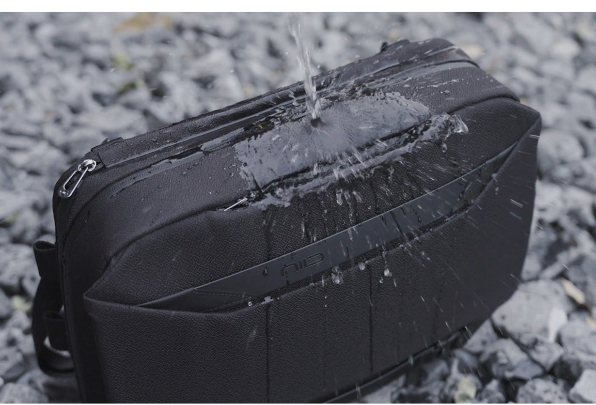 4)水に強い生地採用…仕事用の書類やPCも雨や水から守られます。止水ファスナーを使用しており、隙間からの水の侵入も防ぎます。