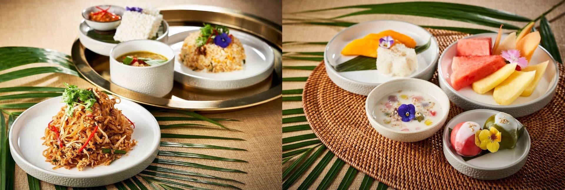 タイでは屋台飯の定番として親しまれている「パッタイ」(写真左: 左下)は、もちもちとした食感の米粉の平麺を使用したタイ版焼きそば。干しエビのコクとナンプラーなどのエスニックな味付けが虜になるおすすめの一品です。他にも、ココナッツの芳醇な香りとスパイシーさが食欲を掻き立てるグリーンカレーや、自家製の海老と豚肉のディップを付けて食べるライスクラッカーなど、本場の味が勢ぞろい。こだわりのタイスイーツは、コロンとした見た目が可愛らしい「カノムコー」(写真右 : 右下手前)は、タイで人気のタロ芋でココナッツとヤシ由来のシュガーを包んだタイ風白玉団子。甘さは控えめで、もちっとした団子の食感とシュガーのサクサク感がアクセントのスイーツです。「ブアロイ」(写真右: 中央)は、タロ芋やカボチャの団子に温かいココナッツミルクをかけたスイーツで、ピリ辛の料理の後にぴったりな一品です。