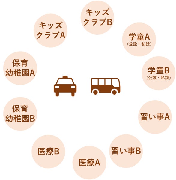 本プロジェクトは、小学校内の学童や保育園、幼稚園と地域の習い事や医療施設間の移動をタクシーやバスで支援する、法人向けプロジェクトです。