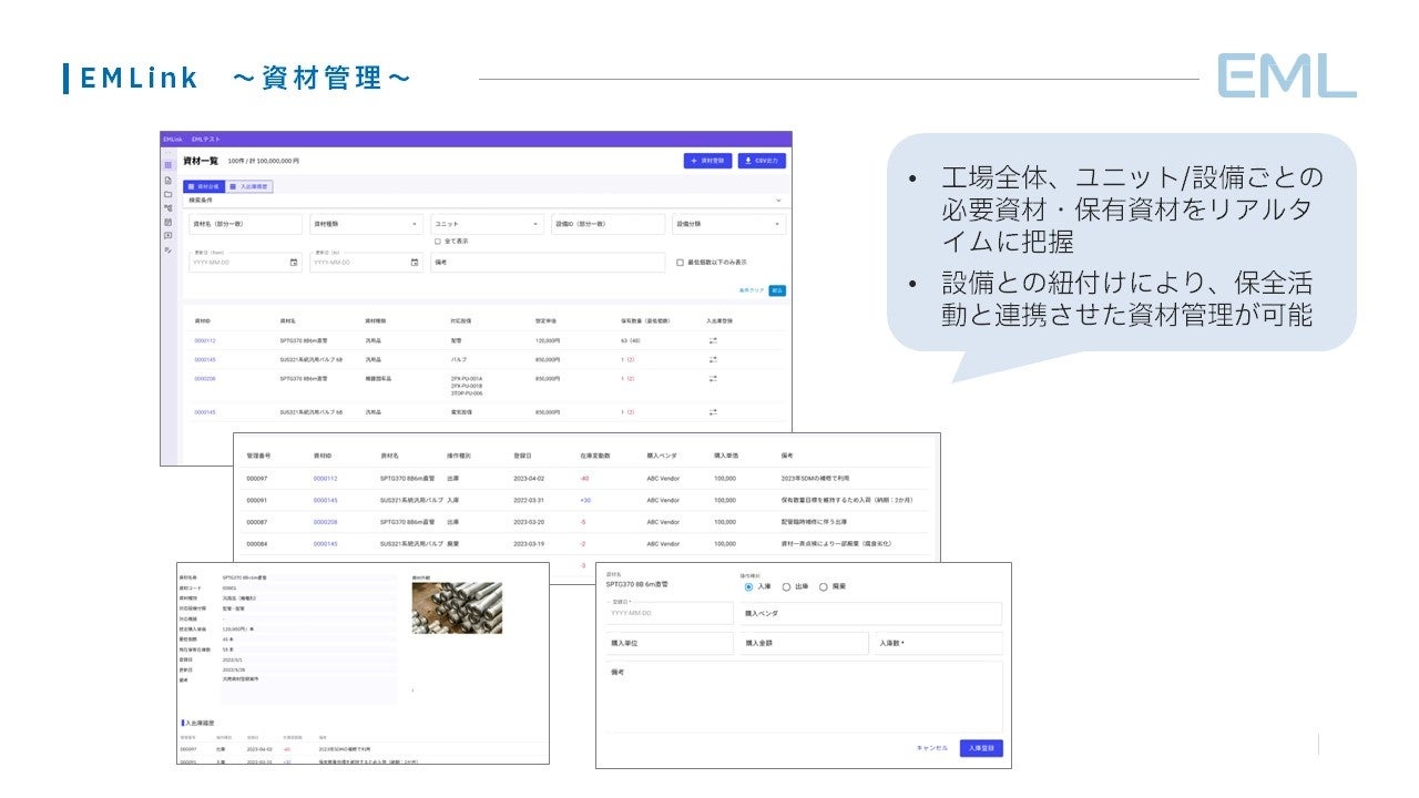 株式会社設備保全総合研究所 (以下、EML) は、プラント・工場特化型の設備保全管理クラウド「EMLink」の新機能となる「資材管理」の提供を開始いたしました。