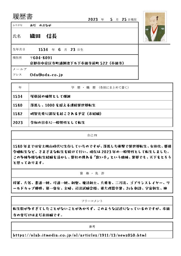 なりきっていただくキャラクターは、既存のキャラクターはもちろん、文房具や家電など、何でも好きなものを自身で設定していただけます。履歴書や面接においては、キャラクターになりきり、架空の経歴をご説明ください。