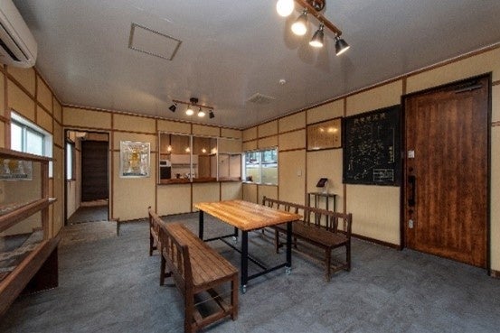 待合室だった場所は飲食が可能なダイニングルームとなりました。内装の見た目をほとんど変えずに補修し、バスの待ち時間に腰かけていた木のベンチや図書室のように本を自由に手に取れる本棚も復元しています。案内所のカウンター、事務室だった場所は調理器具を備え付けたキッチンとなり、当時の名残ある空間で調理をお楽しみいただけます。また、食材は事前予約いただくことで、地域の民宿の協力のもとBBQセット等をご用意します。かつて倉庫等として使用されていた部屋は浴室、トイレ、洗面などの設備とベッドルームにリノベーションされています。