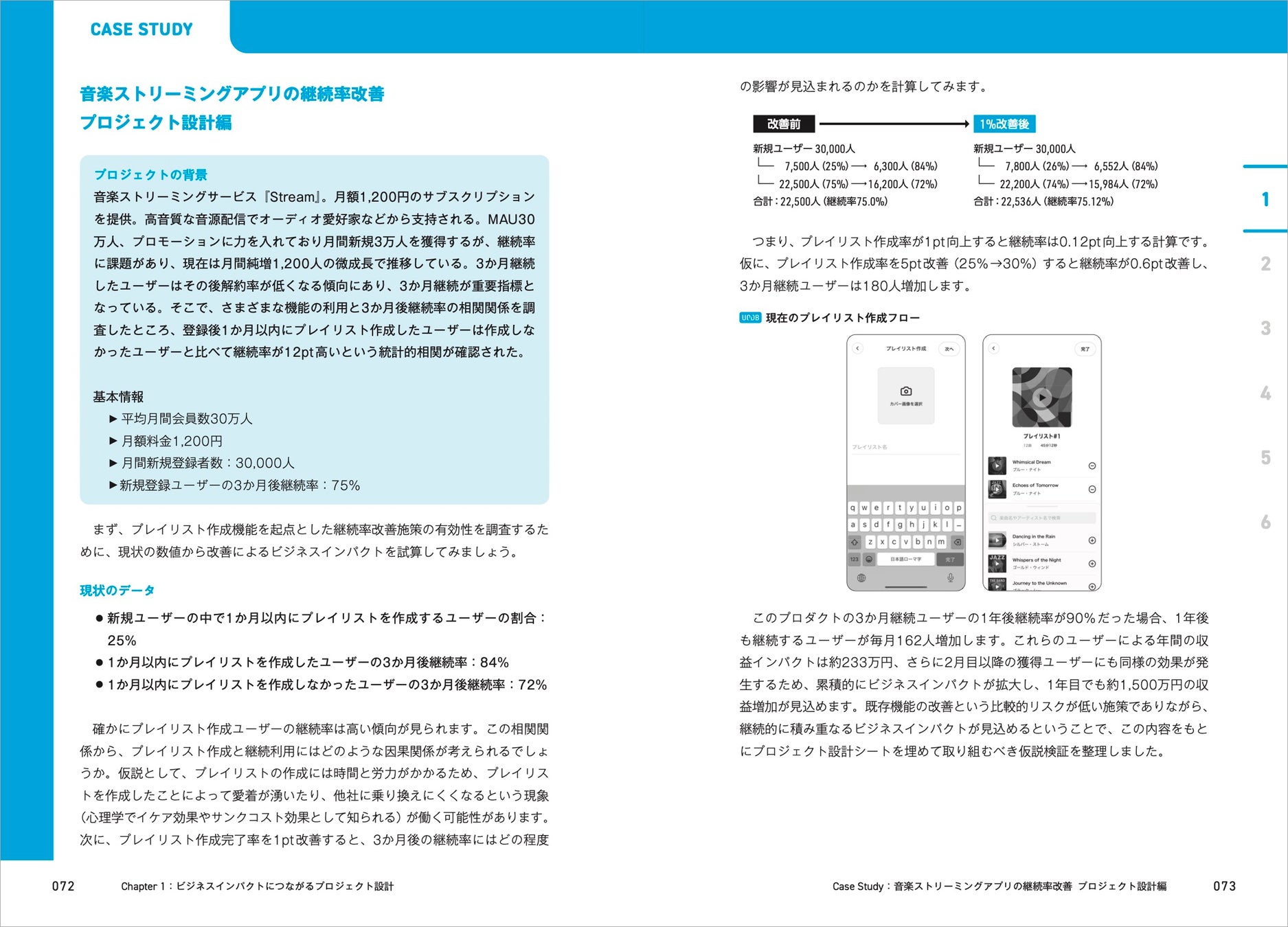 章末では、各章で紹介する手法がどのように実際のプロダクトデザインの現場で活かされるのかを、ひとつのプロジェクトのケーススタディという形で掲載しています。ビジネスインパクトを前提としたデザイン施策がどのようなプロセスを踏んで進められるのかを、プロジェクト設計、プロダクトリサーチ、プロトタイピング、インタラクションデザイン、効果検証と順を追って学ぶことができます。