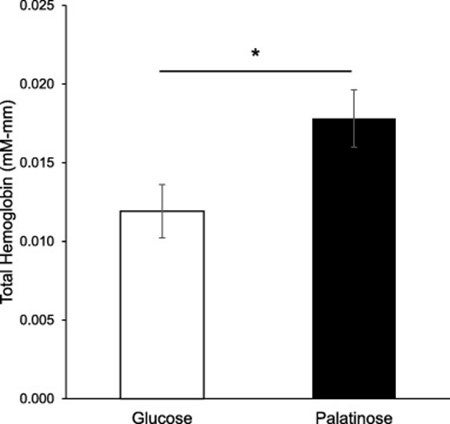パラチノース摂取群はグルコース群よりDVT課題中の脳血流量の増加量が多かった。