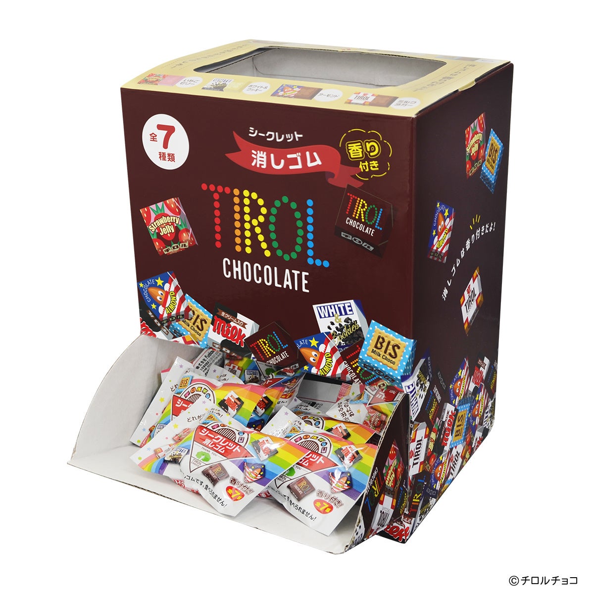 チロルチョコの「バラエティパック」風デザインのパッケージに、チロルチョコ型の消しゴムが入っています。それぞれにミルクチョコレートの香りやいちごの香りが付いている、まるで本物のような仕様です。(消しゴムです。食べられません!)