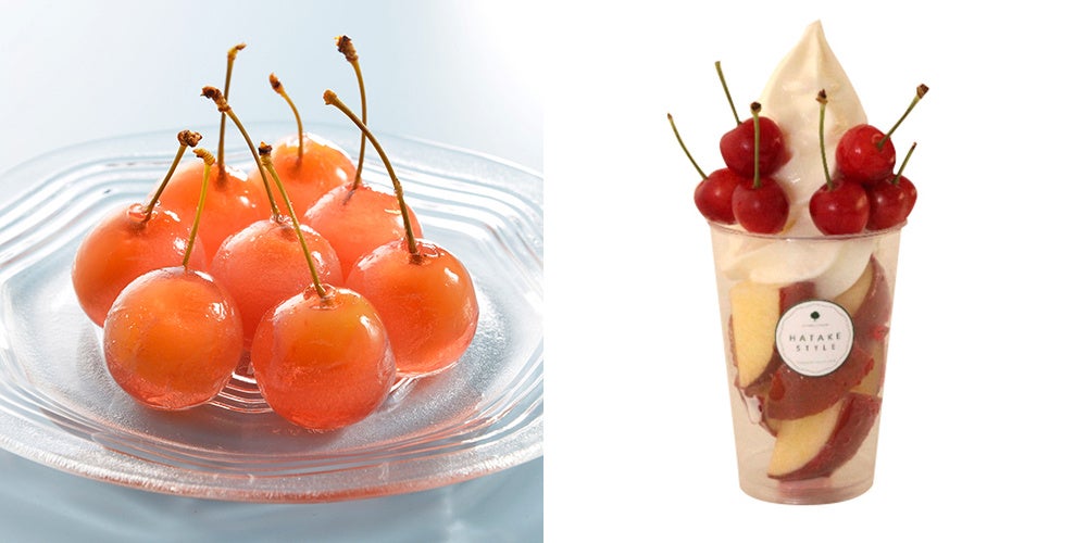 (写真右)果樹園の髙橋フルーツランドが運営するカフェ〈ハタケスタイル〉からりんご飴と佐藤錦の