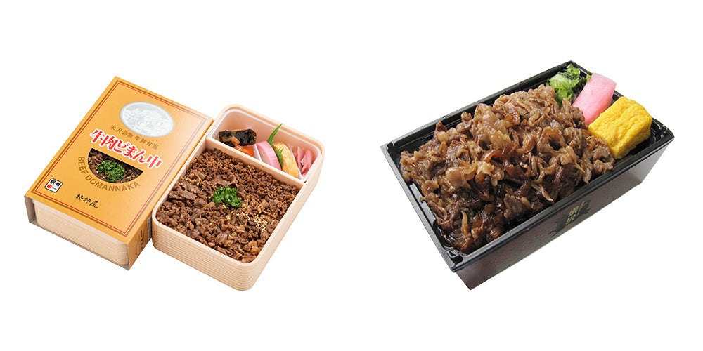 (写真右)旨みがたっぷりのタレで煮込んだ米沢牛を敷きつめた食べ応えのあるお弁当。