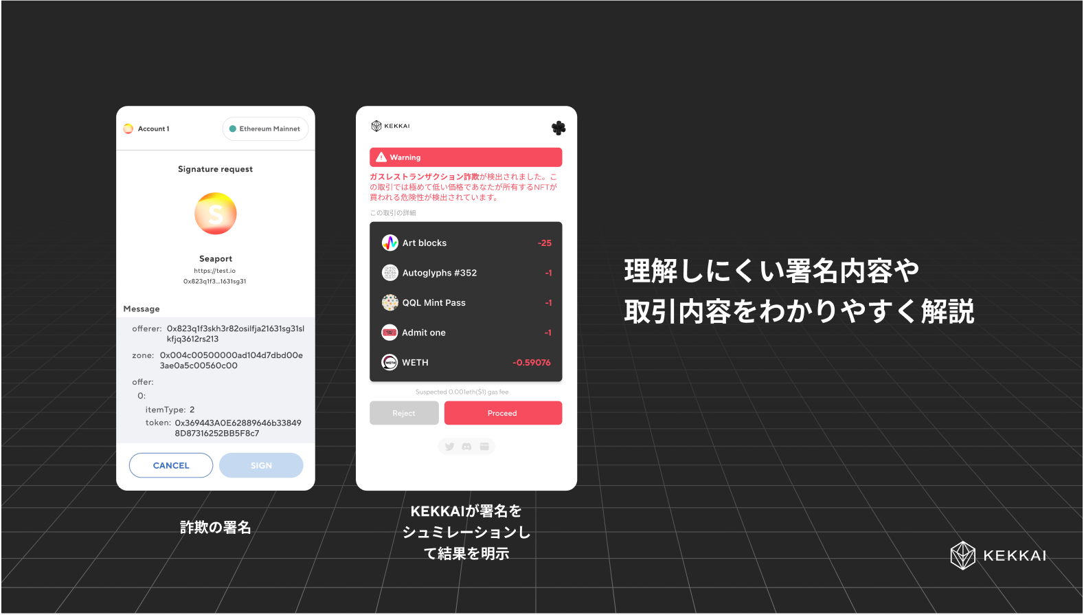 Metamask等のウォレットがトランザクションを実行する前に、KEKKAIがシステム内で取引をシミュレートし、結果を明示します。詐欺被害の多くは気づかず詐欺取引を自分から実行してしまったというケース危険な操作やコントラクトが検出された時には警告が表示されます。