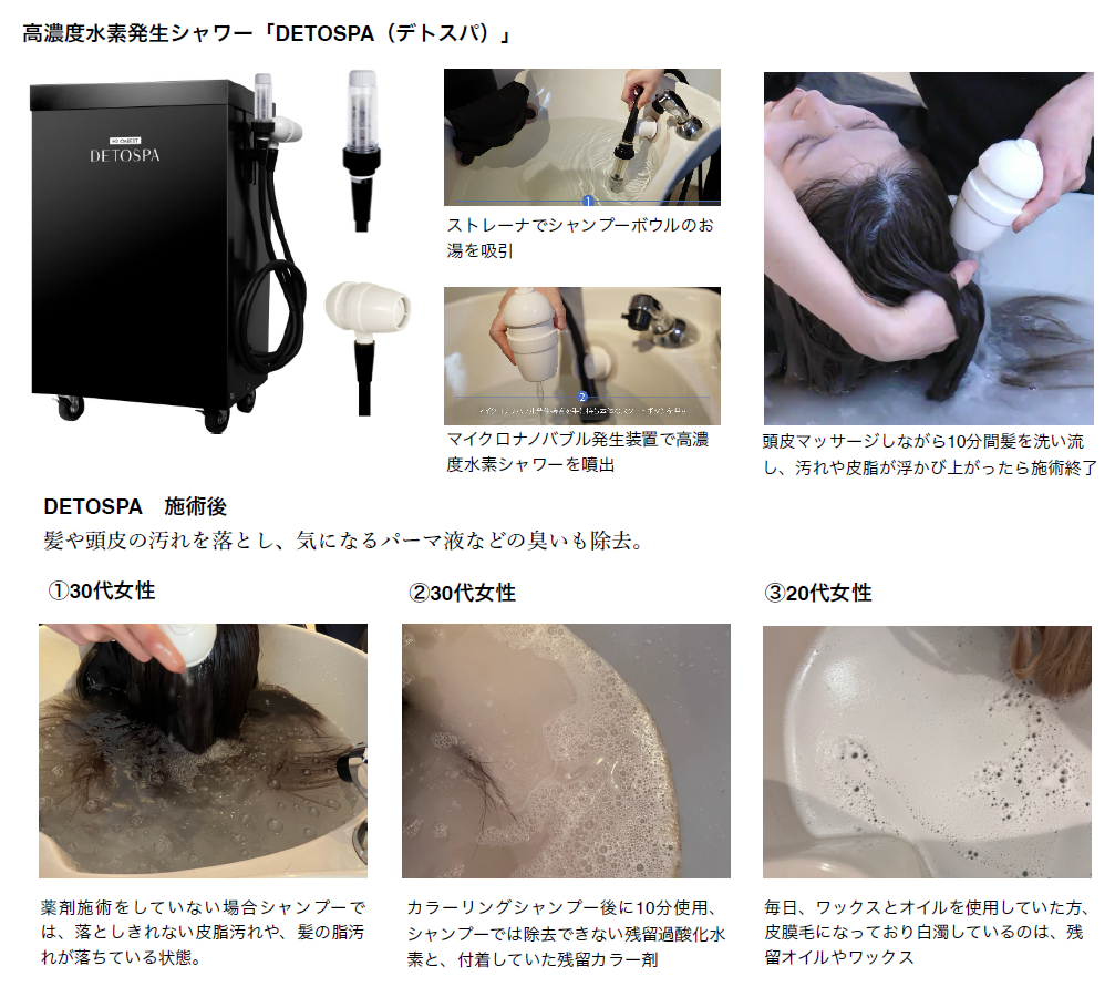 高濃度水素発生シャワー「DETOSPA(デトスパ)」の施術は10分。カラーリングやパーマ、縮毛矯正などサロンのあらゆるメニューに追加することができ、特別な技術も必要無いのでアシスタントでも施術可能。