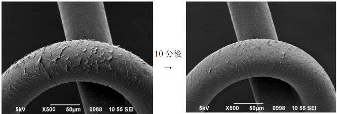その後の毛髪を⾛査型電⼦顕微鏡(⽇本電⼦製)にて観察し、各⽑束を撮影。
