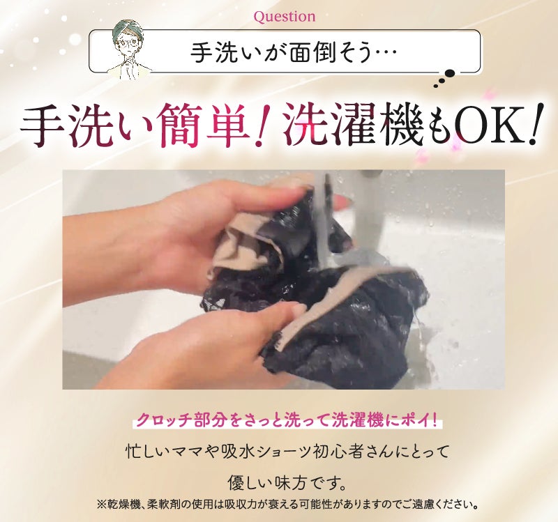 また、表面には速乾素材を使用しているため、ムレやかゆみを抑え、肌をいつでも快適に保ちます。洗濯も簡単で、軽くすすいでから洗濯機に入れるだけ。忙しい女性でも手軽にケアできる仕様です。