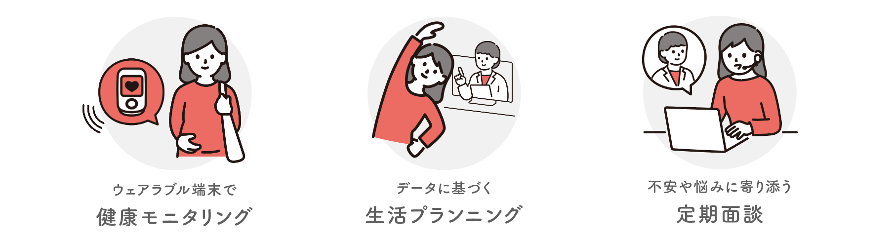 MamaWellでは、妊娠育児期女性を対象とした伴走型健康支援サービスを提供しています。このサービスは、各利用者へ専属の助産師が伴走し、ウェアラブルデバイスを通じた利用者様の健康データに基づいて、個別最適化されたメディカルサポートを行います。日々の体調変化に基づいた具体的な健康管理とプランニングを行うことで妊娠合併症やその他の医学的リスクを低減し、女性が健康を維持しながら職場で活躍するための支援を、企業様・妊婦様の両面から支援しています。