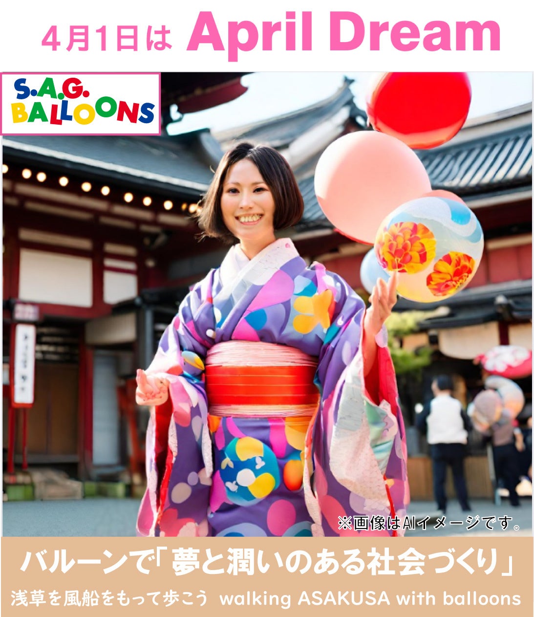 エスエージーバルーンズ株式会社は(本社:東京都墨田区、代表取締役社長:矢部 信彦、以下S.A.G.)は、4月1日を夢を発信する日にしようとするApril Dreamに賛同しています。このプレスリリースは「S.A.G.」の夢です。