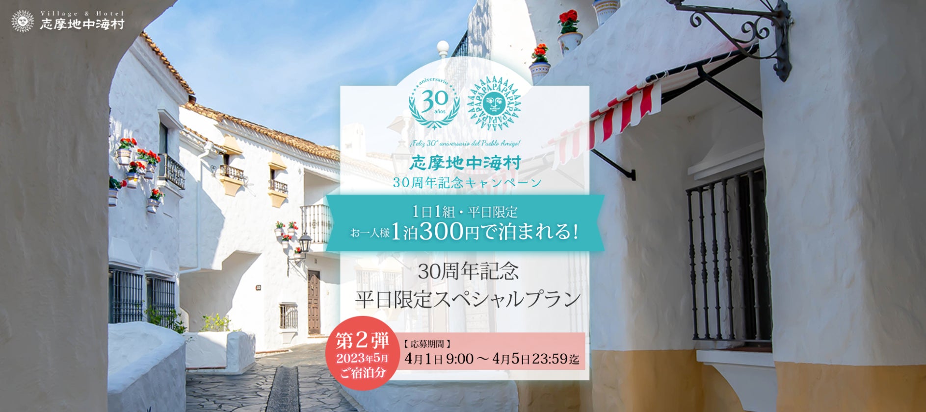 【志摩地中海村】1名様一泊二日300円!5月もやります! さらにマルシェの開催&お得な限定ペア宿泊券の販売も「開業30周年記念イベント」第2弾 発表!