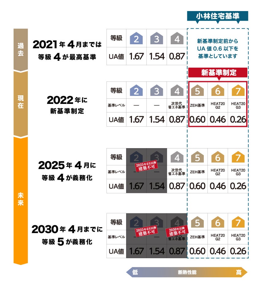 2022年4月からZEHを基準として断熱等級5が、10月からは新たにZEHを超える新基準として、断熱等級6・7が新設されました。