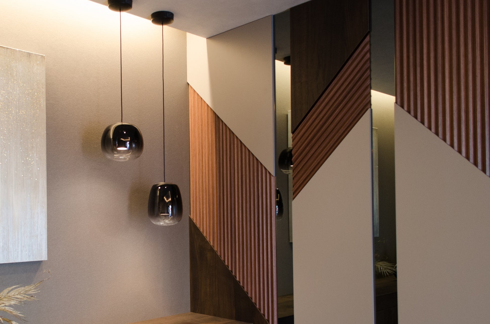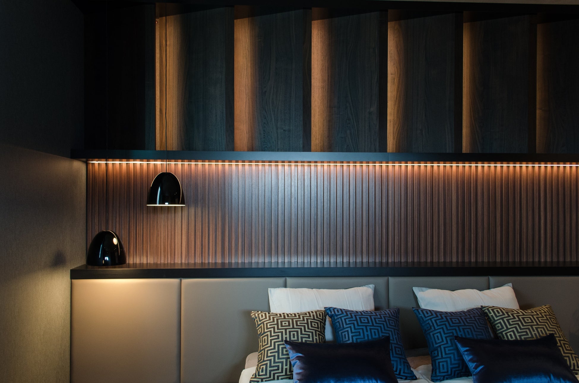 ファブリックのベッドヘッドとアクセントのリブボードを光で演出したラグジュアリーなベッドルーム。