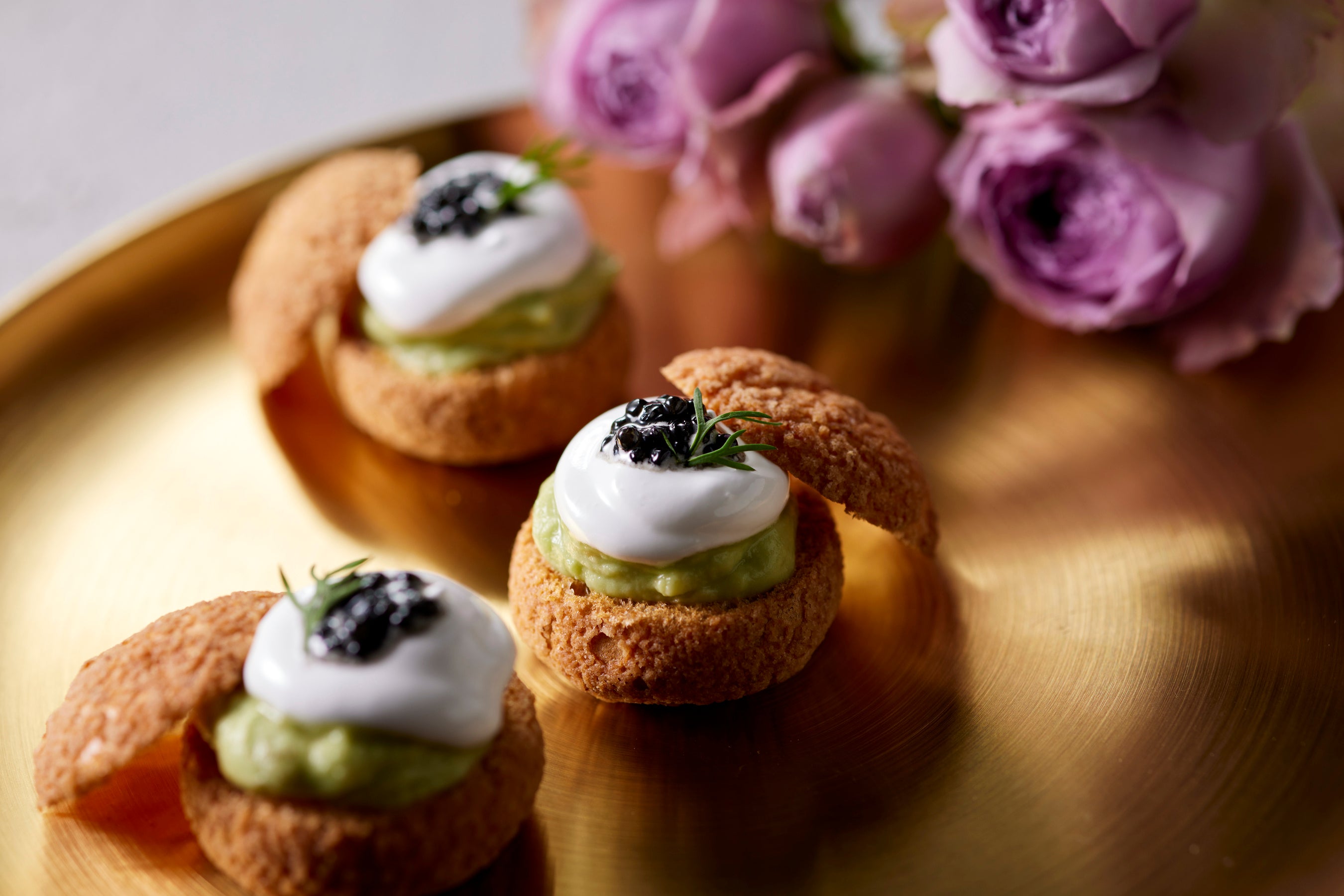 プチシューにアボカド&マスカルポーネとawaはちみつ。更に国産キャビアを贅沢に添えて。アボカドクリームのクリーミーな舌触りと、キャビア本来の旨味と塩味が、ふわふわ食感で優しい甘さのawaはちみつを引き立てます。新しいawaはちみつの食べ方提案。
