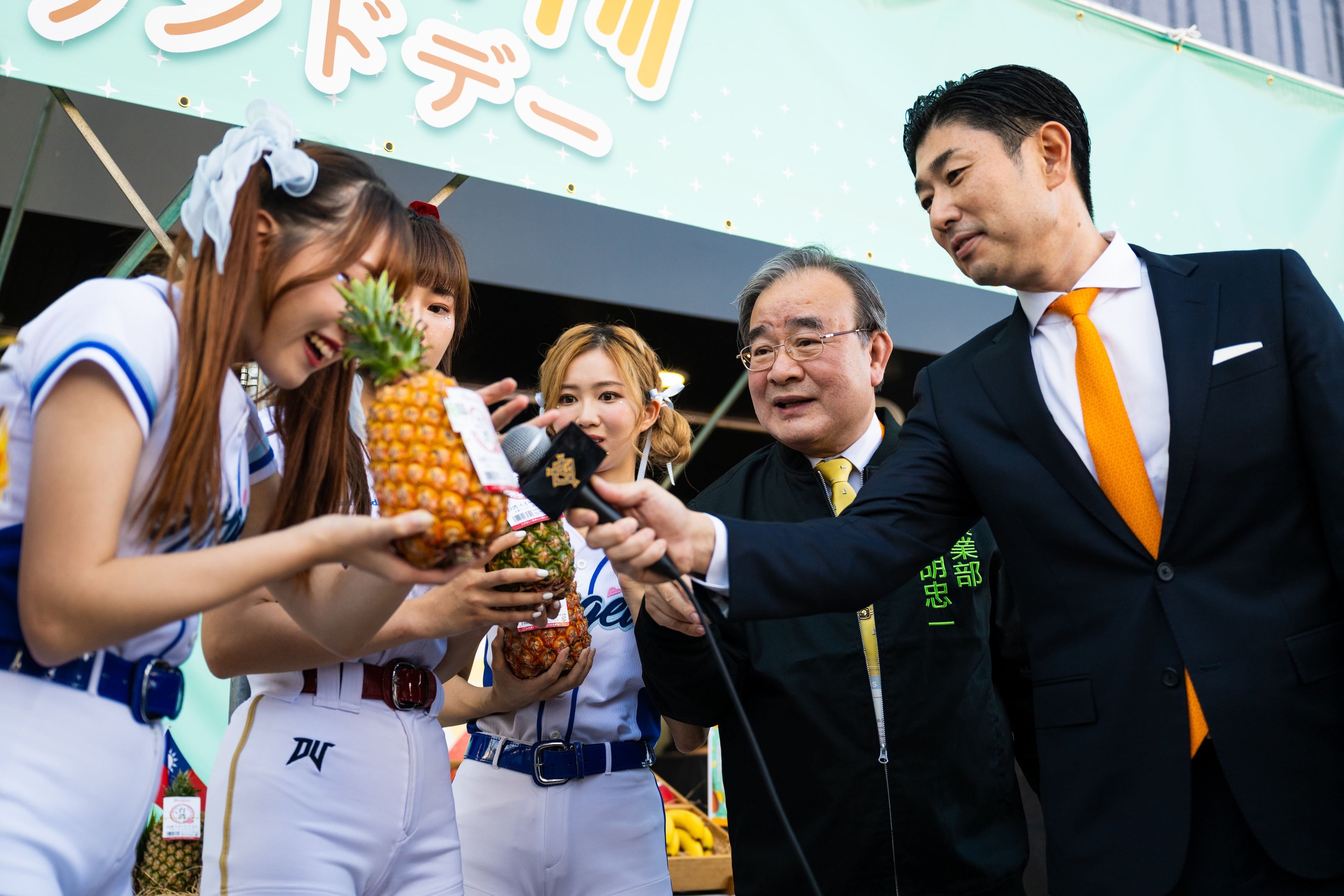 読売ジャイアンツは今年で創設90周年を迎え、セントラル・リーグ所属の名門チームである。本日の試合は福岡ソフトバンクホークスとの交流戦であり、東京ドームには4万人を超える観客が集まった。「台湾フルーツブランドデー」では、球場内の看板設置やテレビ放送でのPRだけでなく、先着1万人の入場者に、台湾フルーツをテーマにした特製の扇子が配られた。また、チケット検査口付近には「台湾フルーツ展示コーナー」が設置され、新鮮で香り高く甘い台湾のパイナップルとマンゴーが展示された。農業部の胡次長は球場司会者である高橋氏と共に、観客に台湾パイナップルの選び方を伝授し、台湾プロ野球、富邦ガーディアンズ及び楽天モンキーズのチアガールが実際にデモンストレーションを行った。より多くの日本消費者が実際に店舗で、台湾パイナップルを自身で選び楽しむことを期待している。