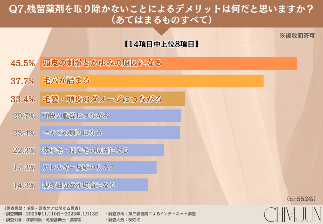 「残留薬剤を取り除かないことによるデメリットは何だと思いますか?(あてはまるものすべて)」と聞いたところ、『頭皮の刺激とかゆみの原因になる(45.5%)』が最も多く挙げられました。