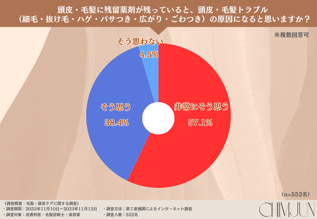 『非常にそう思う(57.1%)』『そう思う(38.4%)』と9割以上の方が残留薬剤は頭皮・毛髪トラブルの原因になると回答しました。