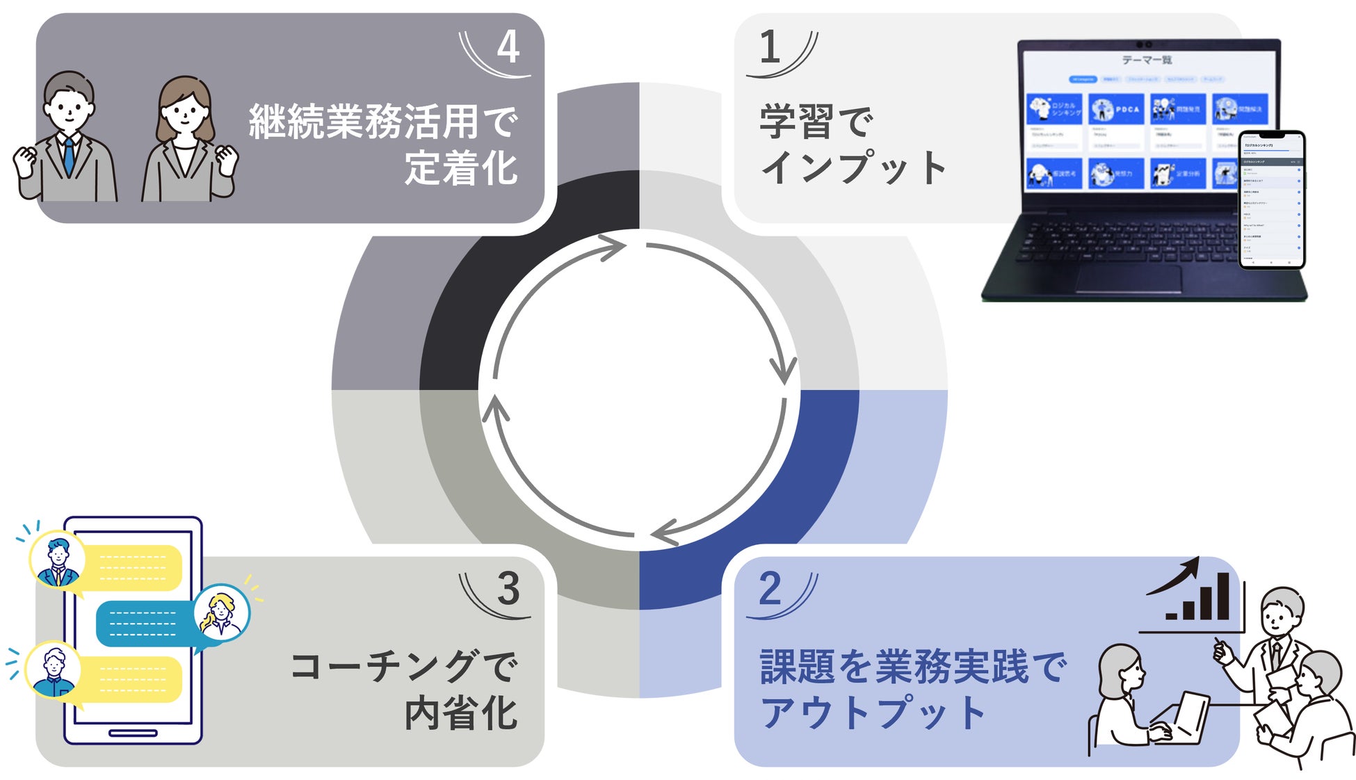 週に1、2本のコンテンツをオンラインで好きな時間に学習して頂き、実践課題を通してご自身の業務で活用頂きます。業務での活用を専属コンサルタントがチャットでフォローします。学習内容が業務で活用できるようになったら、次のコンテンツに進んでいきます。