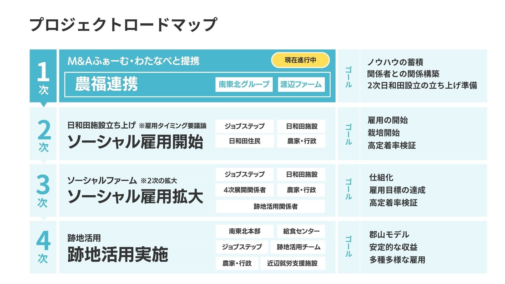 RESTA は、昨年より全国の事例調査や南東北病院グループとの視察を重ねながら、医療・福祉の 現場における言語聴覚士としての専門性やソーシャル事業・イベント立ち上げの経験を活かし、事業コンセプトの考案から栽培作物の選定まで、同グループのソーシャルファーム事業計画立案を支援 してきました。1 年間の事前準備を終えて、今後本事業の立ち上げを以下のロードマップで進めてい きます。まずは、しいたけ・ねぎの栽培を手掛ける有限会社 M&A ふぁーむ・わたなべ(福島県三春 町)と提携し、農福連携の枠組みを構築し、椎茸栽培・農福連携に関するノウハウの蓄積や安定 的な生産に向けた農業従事者や行政といった各ステークホルダーとの関係構築を進めます。