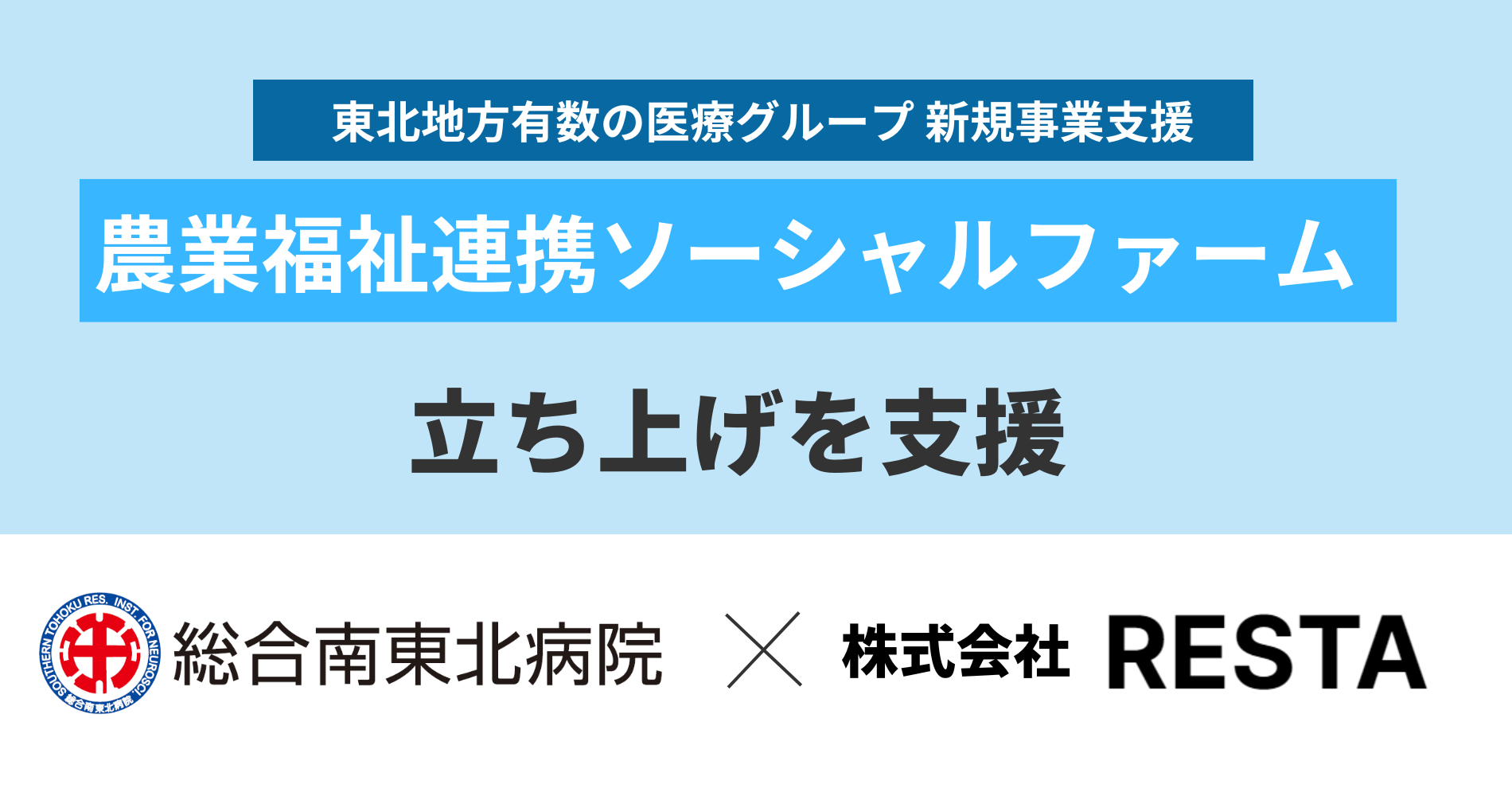 IT を活用した障害者特化キャリア事業を展開する株式会社 RESTA(本社:東京都渋谷区、代表取締役:松川力也、以下「RESTA」)は、東北地方有数の医療グループである、南東北病院 グループが設立を計画する農業福祉連携ソーシャルファームの立ち上げを支援します。ソーシャルファ ームは、自律的な経済活動を行いながら、必要なサポートを受け、他の従業員と共に働いている社 会的企業を示します。RESTA は、誰しもが再挑戦できる社会を目指し、今後障害者だけではなく、 就労に困難を抱える方向けに雇用機会を創出し、ソーシャルファーム立ち上げ支援事業を展開します。