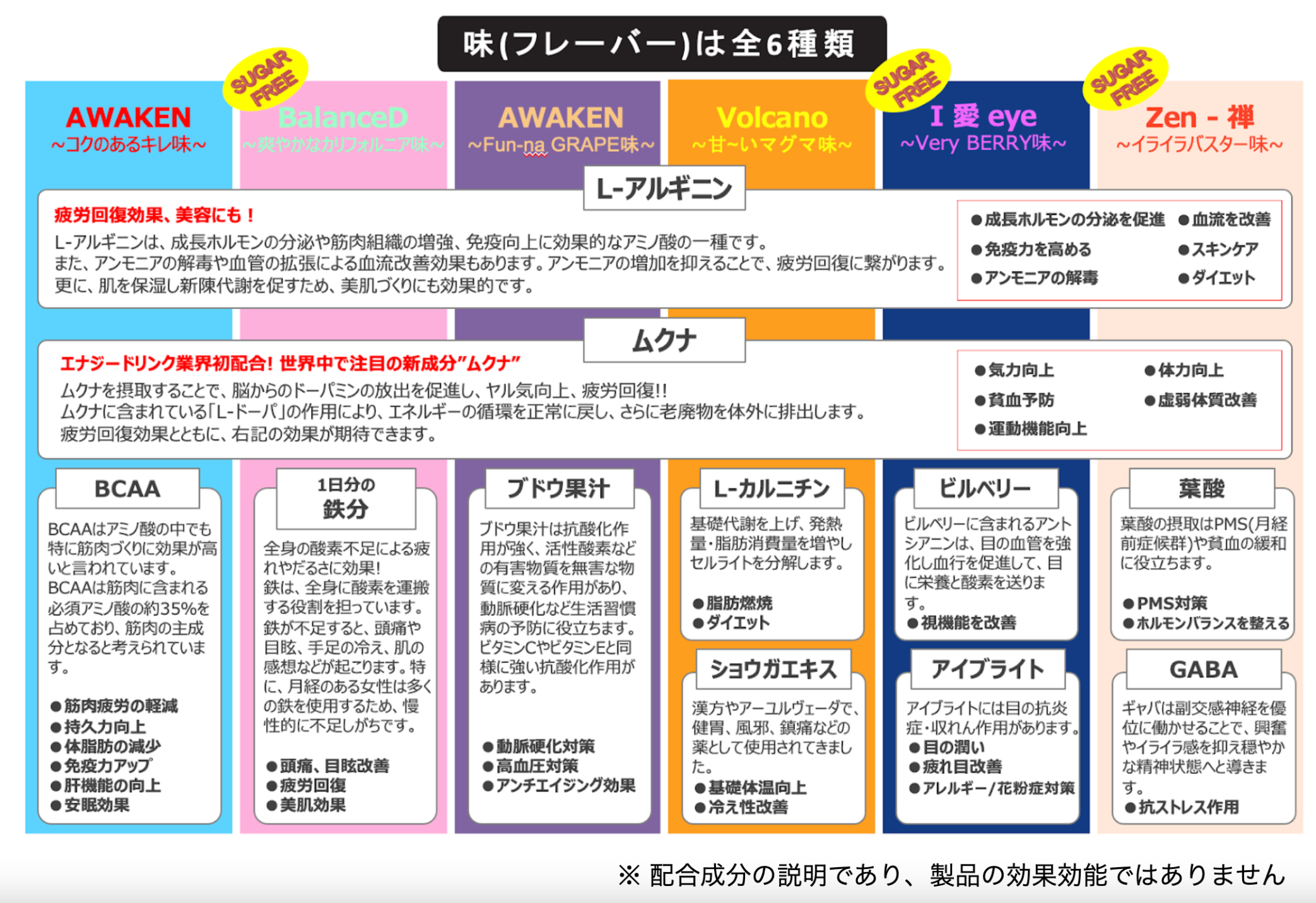 ■すべてのフレーバー(味)共通成分として、エナジードリンク業界最強クラスの「L-アルギニン」配合量!また飲料では珍しい原料のムクナを配合。(ムクナにはドーパミンの素になる「L-ドーパ」が多く含まれています)