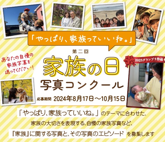 【やっぱり、家族っていいね。】のテーマに合わせた、家族の大切さを表現する自慢の家族写真など、【家族】に関する写真と、そのエピソードを募集します。