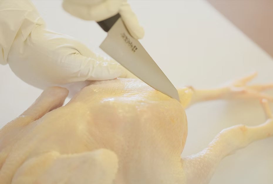 熟練の職人が、一羽一羽の状態を見極め、肉の繊維を傷つけぬよう丁寧に解体します。機械では再現できないこの手仕事が、肉本来の保水力を保ち、驚くほどのジューシーさを生み出します。また、余分なスジや骨まで的確に取り除くことで、高い歩留まりと調理のしやすさを実現しています。
