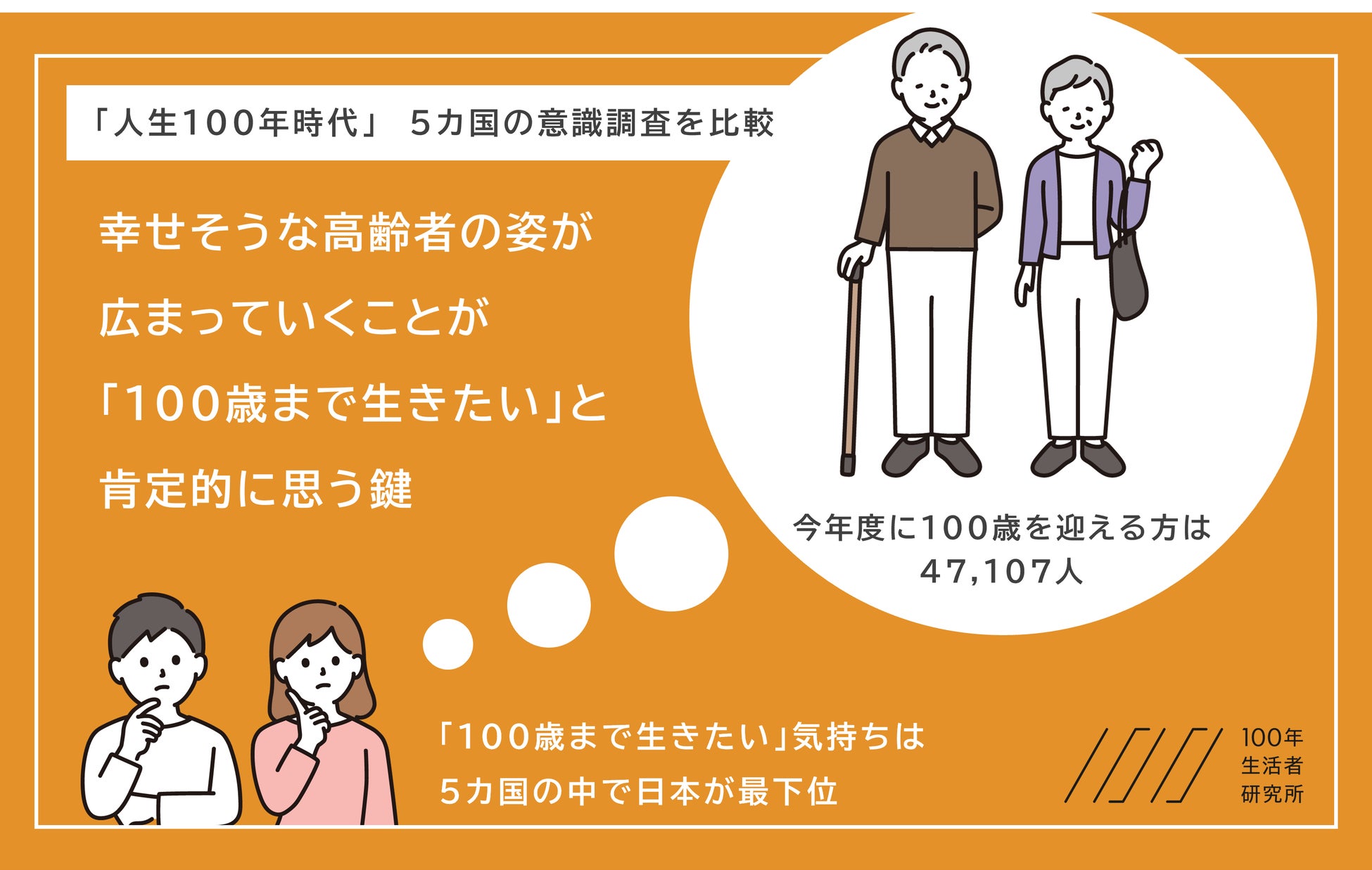 9月15日の「老人の日」に合わせて厚生労働省が発表した百歳高齢者表彰の対象者は前年よりも1,966人多い47,107人だった一方、当研究所設立時の調査では100歳まで生きたいと考えている日本人が3割にとどまりました。これが日本特有であるのかを明らかにするため、他国が人生100年時代をどのように受け止めているのかを調べ、昨年3月に実施した国内調査と比較したところ、「100歳まで生きたい」気持ちや幸福度は日本が対象5か国で最も低いことが分かりました。しかしながら他の調査結果を踏まえると、幸せに過ごしている100歳のロールモデルが身近にいれば、日本人の100歳まで生きたい気持ちを向上させる可能性が示唆されました。