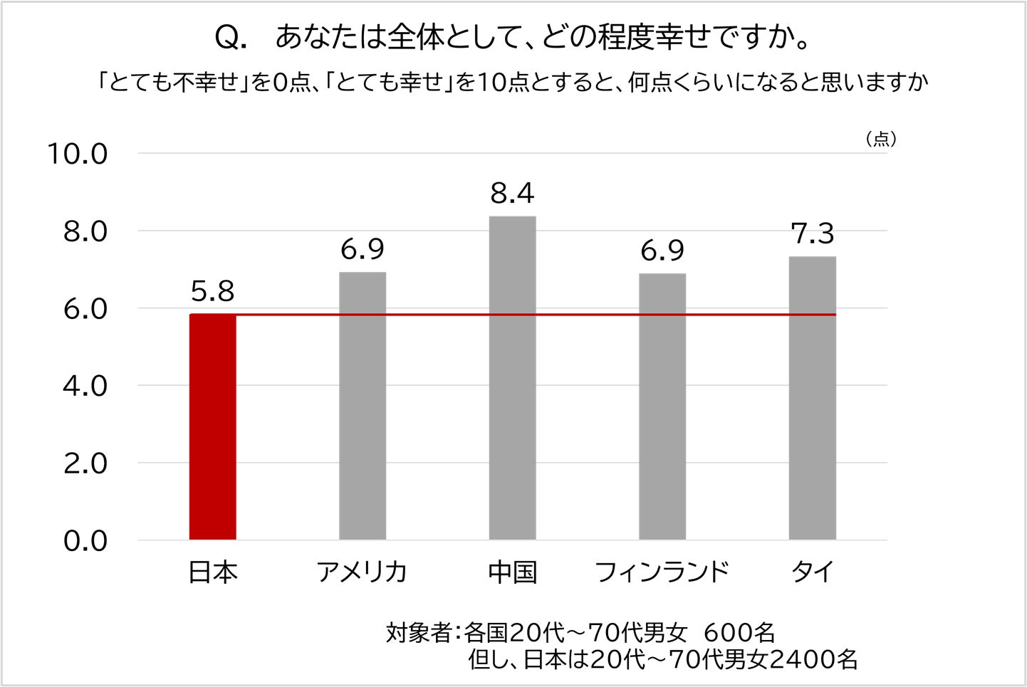 10点満点で幸福度を質問したところ、日本の平均点は5.8点で対象5か国の中で最も低い結果となりました。一方、最も高かったのは中国の8.4点で、タイ(7.3点)、アメリカとフィンランド(どちらも6.9点)と続きました。