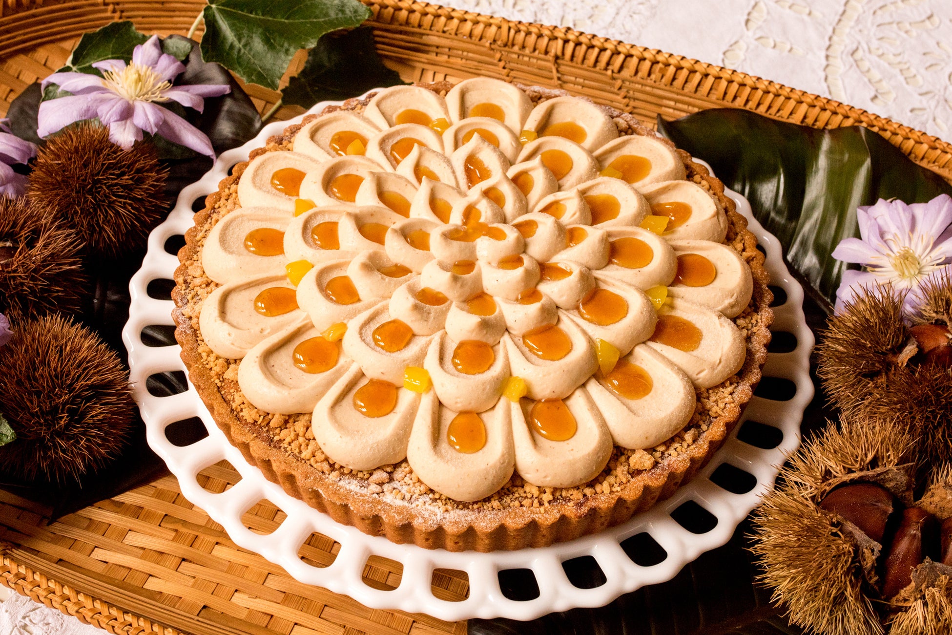 タルトにたっぷりの栗を詰めてメイプル風味のクッキーと共に焼き、仕上げにコクのある栗クリームを絞りました。コリアンダー風味のカシスと木苺のジャムがアクセントです。