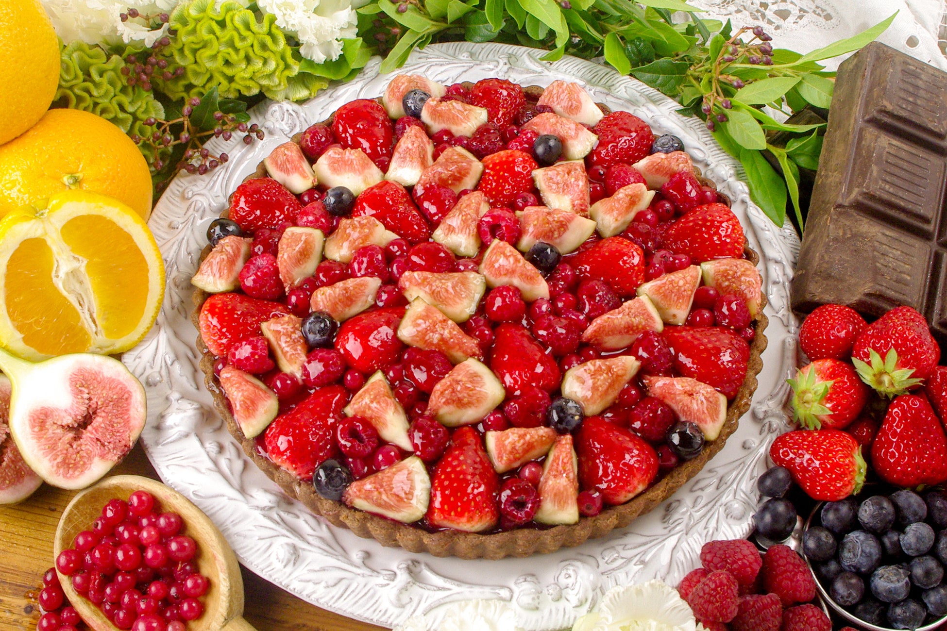 コクのあるチョコレートムースとイチジクやイチゴなど、色鮮やかな赤いフルーツを組み合わせた、フレッシュで味わい深いタルトです。オレンジ風味のカスタードクリームの爽やかな香りと、ココアのタルト生地のほろ苦い味わいが味のアクセントになっています。
