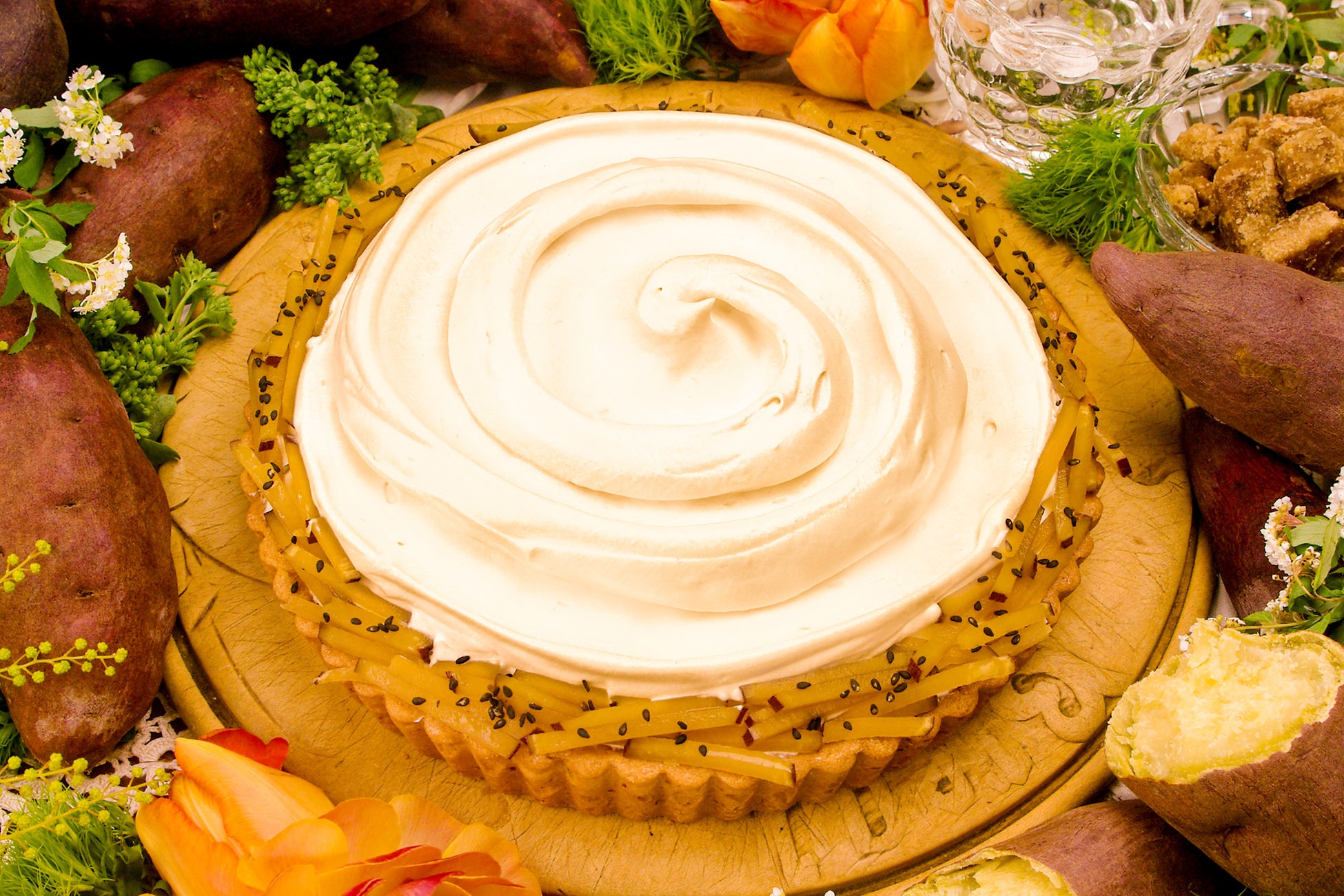キャラメリゼしたさつまいもにかのこ豆を合わせ、タルト一面に敷き詰めました。じっくり焼いたココナッツクリームに小豆クリームをたっぷり使用した、食べごたえのあるタルトです。小豆クリームに合わせた求肥の食感にチーズペーストの塩気など、隠し味と共にお楽しみください。