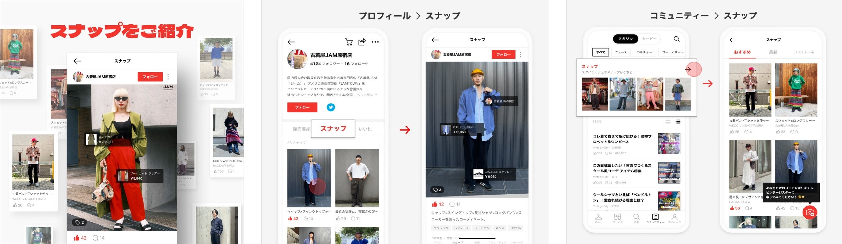 アプリ内のコミュニティコンテンツに、ショップの店員さんをはじめ、Vintage.Cityの会員であれば誰でもコーディネートを投稿できる古着特化のスナップサービスをオープンしました。現在200コーデ以上の多様なスタイルの古着スナップが掲載されています。古着を好きな人が自身のスタイルを共有できるコミュニティとして、今後様々な企画を実施する予定です。